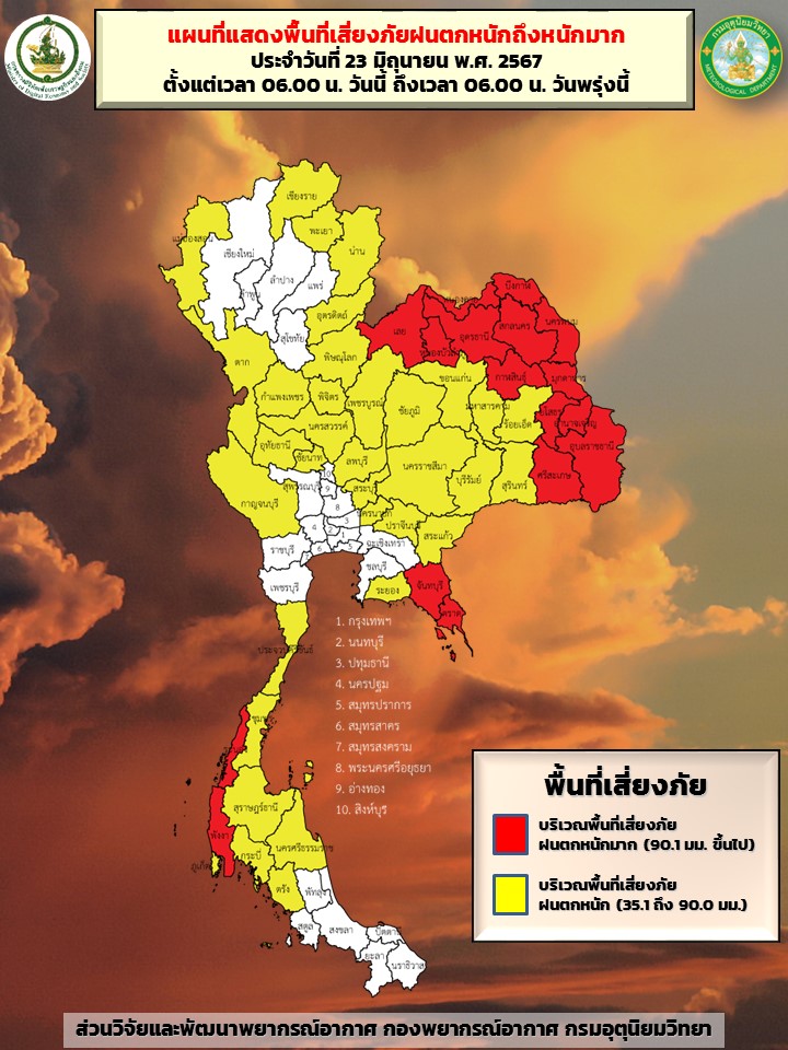 กทม. 23 มิ.ย.- กรมอุตุฯ เตือนทั่วไทยฝนตกหนักหลายแห่ง โดยเฉพาะภาคอีสาน ตะวันออก และภาคใต้ฝั่งตะวันตก เฝ้าระวังน้ำท่วมฉับพลัน น้ำป่าไหลหลาก