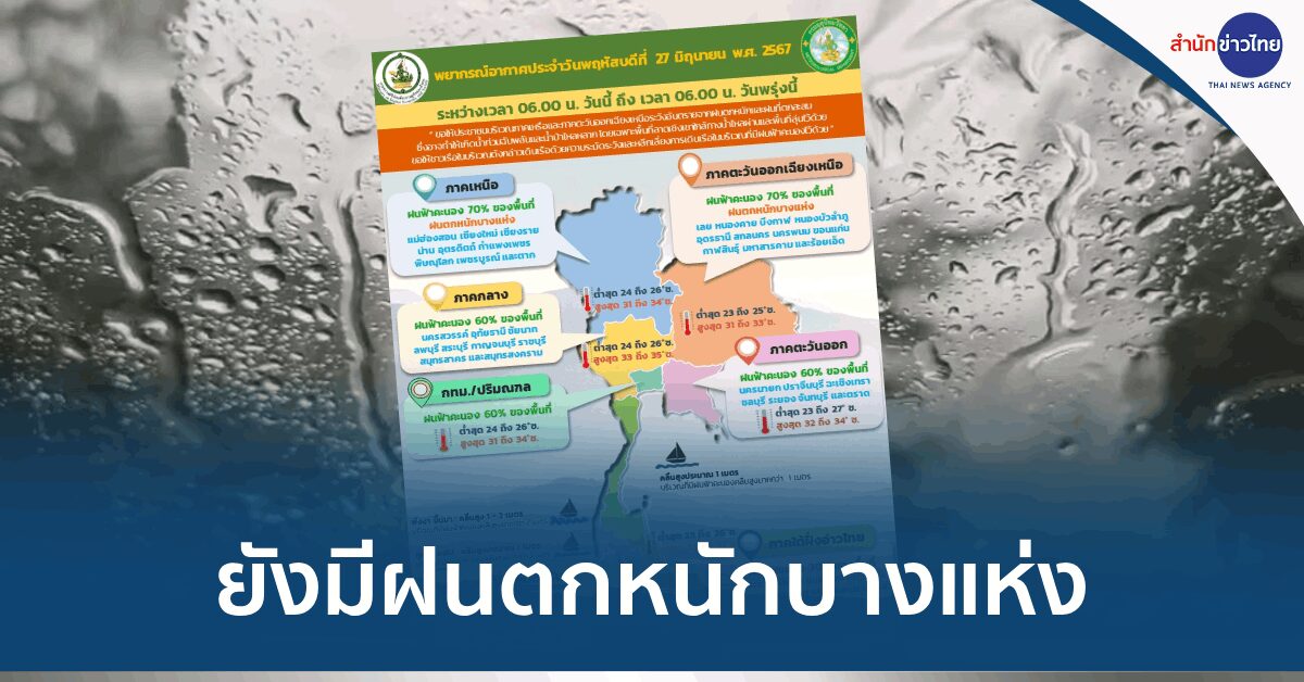 กรุงเทพฯ 27 มิ.ย. – กรมอุตุฯ เผยไทยตอนบนยังคงมีฝนตกหนักบางแห่งในภาคเหนือ และภาคอีสาน ส่วนภาคใต้มีฝนฟ้าคะนองบางพื้นที่ ขณะที่ กทม.-ปริมณฑล ฝนฟ้าคะนอง 60% ของพื้นที่