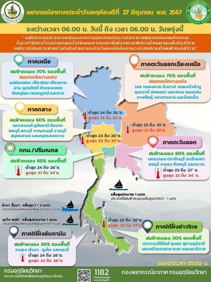 กรมอุตุนิยมวิทยา พยากรณ์อากาศ 24 ชั่วโมงข้างหน้า ร่องมรสุมพาดผ่านภาคเหนือ และภาคตะวันออกเฉียงเหนือตอนบน ในขณะที่มรสุมตะวันตกเฉียงใต้กำลังค่อนข้างแรงที่พัดปกคลุมทะเลอันดามัน ภาคใต้ และอ่าวไทยเริ่มมีกำลังอ่อนลง ลักษณะเช่นนี้ทำให้ประเทศไทยตอนบนยังคงมีฝนตกหนักบางแห่งในภาคเหนือ และภาคตะวันออกเฉียงเหนือ ส่วนภาคใต้มีฝนฟ้าคะนองบางพื้นที่ ขอให้ประชาชนในบริเวณดังกล่าวระวังอันตรายจากฝนตกหนักและฝนที่ตกสะสม ซึ่งอาจทำให้เกิดน้ำท่วมฉับพลันและน้ำป่าไหลหลาก โดยเฉพาะพื้นที่ลาดเชิงเขาใกล้ทางน้ำไหลผ่านและพื้นที่ลุ่มไว้ด้วย