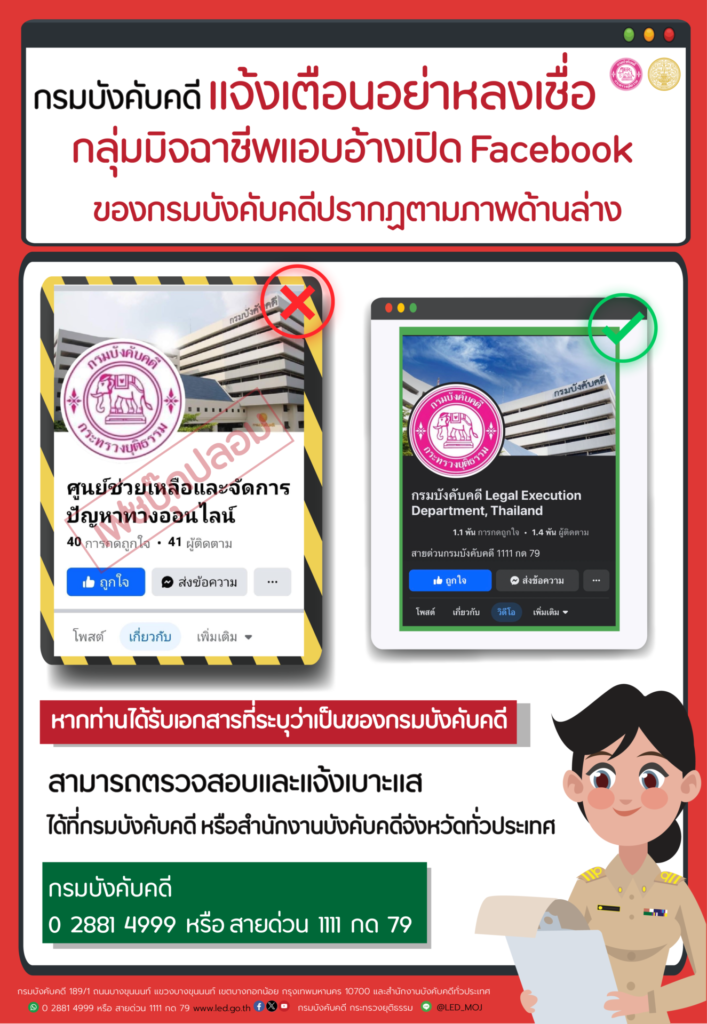 กรมบังคับคดี 9 ก.ค. – กรมบังคับคดี เตือน! เพจ ศูนย์ช่วยเหลือและจัดการปัญหาทางออนไลน์ เป็นเพจปลอมอย่าหลงเชื่อ ยืนยันกรมฯ มีเพจเดียว www.led.go.th เท่านั้น