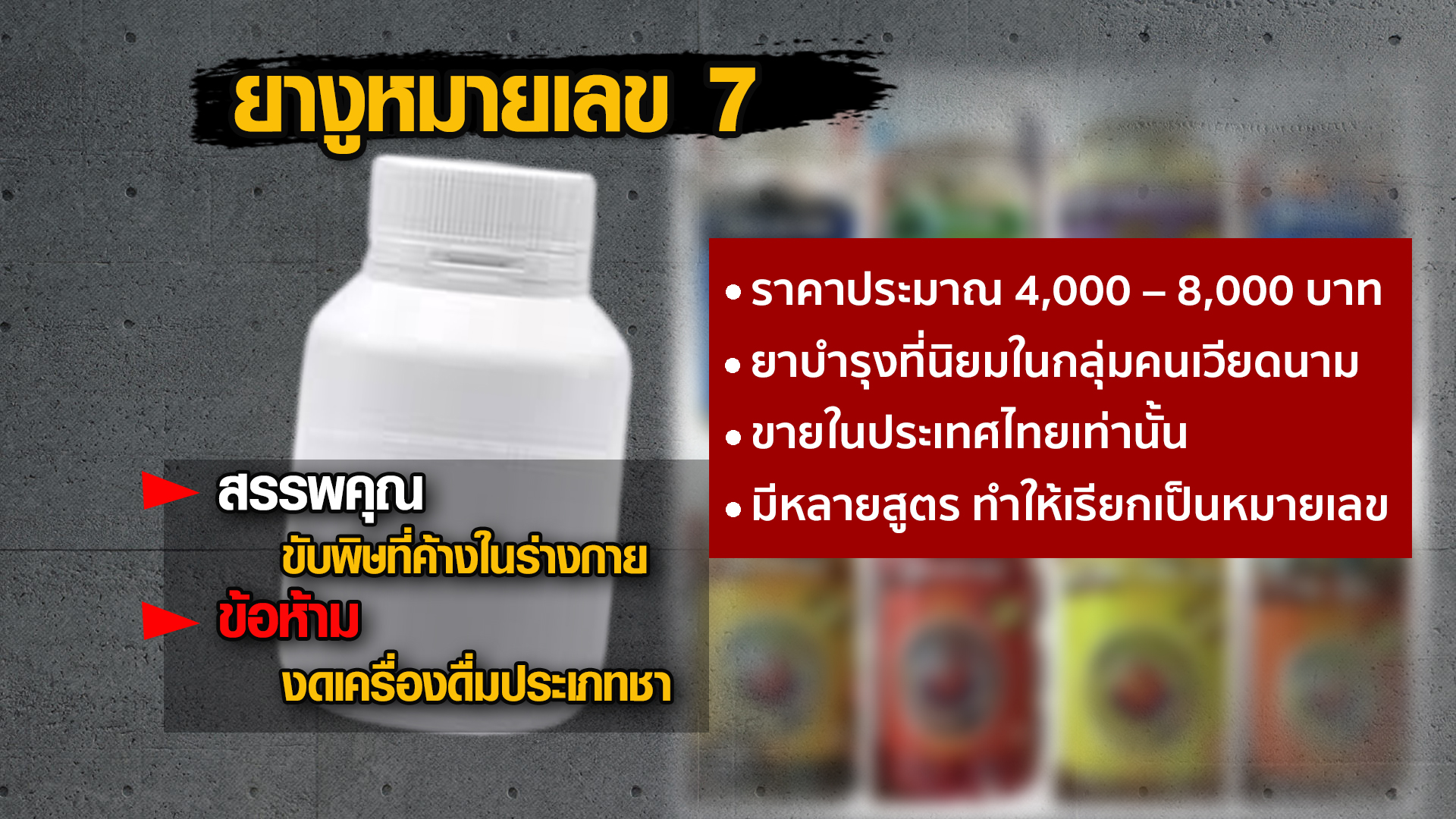 “ยางู” เป็นยาบำรุงร่างกาย คนเวียดนามนิยมรับประทานมานานเป็น 10 ปีแล้ว ยาชนิดนี้จะเป็นกระปุกเป็นเม็ดๆ มีหลายสี ซึ่งยาดังกล่าวจะขายในประเทศไทยเท่านั้น ไม่มีขายในประเทศเวียดนาม ทำให้คนเวียดนามที่เดินทางเข้ามาในประเทศไทยมักฝากไกด์ซื้อ เพื่อการบริโภค ส่วนหมายเลข 7 คาดว่าเป็นสรรพคุณ ราคาขวดละ 3,000-8,000 บาท แล้วแต่สูตร