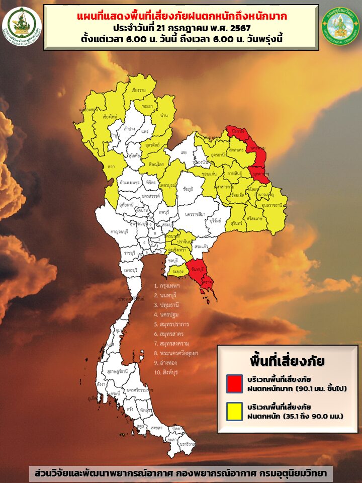 กทม. 21 ก.ค.- กรมอุตุฯ เตือนภาคอีสานและภาคตะวันออก เตรียมรับมือฝนตกหนักบางแห่ง อาจเกิดน้ำท่วมฉับพลัน น้ำป่าไหลหลาก