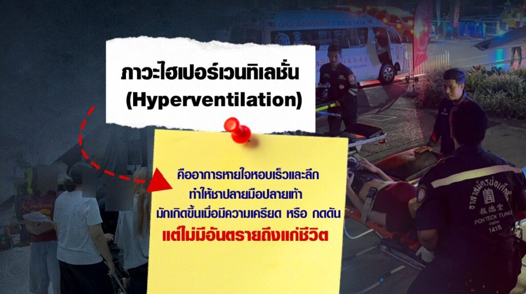 ขณะที่เจ้าหน้าที่กู้ชีพฯ ระบุว่า อาการเบื้องต้นคือ ภาวะไฮเปอร์เวนทิเลชัน (Hyperventilation) คือ อาการหายใจหอบเร็วและลึกอยู่นาน ทำให้เกิดอาการชาปลายมือปลายเท้า หรือมือเท้าจีบเกร็ง ซึ่งอาการดังกล่าวมักเกิดขึ้นเมื่อมีความเครียด วิตกกังวล หรือกดดันหนักมากเกินไป หากมีอาการดังคล้ายดังกล่าวให้ค่อยๆ พยายามสูดลมหายใจเข้าออกช้าๆ และอยู่ในที่ๆ มีอากาศปลอดโปร่ง และหากไม่รู้สึกดีขึ้นควรแจ้งเจ้าหน้าที่เข้าช่วยเหลือหรือรีบไปโรงพยาบาล ซึ่งอาการดังกล่าวเกิดขึ้นเป็นครั้งคราว และไม่มีอันตรายถึงแก่ชีวิต แต่อาจส่งผลรบกวนต่อการดำเนินชีวิตประจำวัน