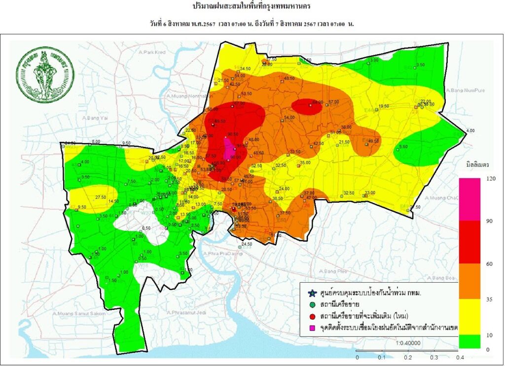 นายเอกวรัญญู อัมระปาล โฆษกของกรุงเทพมหานคร เปิดเผยถึงสถานการณ์ฝนตกและน้ำท่วมในพื้นที่กรุงเทพมหานครวานนี้ (6 ส.ค.) โดยเรดาร์ตรวจพบกลุ่มฝนเคลื่อนเข้าพื้นที่ กทม. เมื่อเวลา 20.30 น. บริเวณเขตหนองแขม ในขณะเดียวกันมีกลุ่มฝนก่อตัวในพื้นที่บริเวณเขตชั้นในของ กทม. ต่อมากลุ่มฝนทั้งในและนอกพื้นที่ขยายตัวรวมกันปกคลุมพื้นที่ฝั่งพระนคร รวมทั้งฝั่งธนบุรีตอนบน ลักษณะเป็นกลุ่มฝนใหญ่เคลื่อนตัวทิศตะวันออกช้า ๆ โดยกลุ่มฝนตกต่อเนื่องและหยุดตกเวลา 03.00 น. ของวันที่ 7 ส.ค.67 โดยปริมาณฝนสูงสุด ที่จุดวัดประตูระบายน้ำคลองลาดพร้าว เขตวังทองหลาง วัดได้ 91.5 มม.