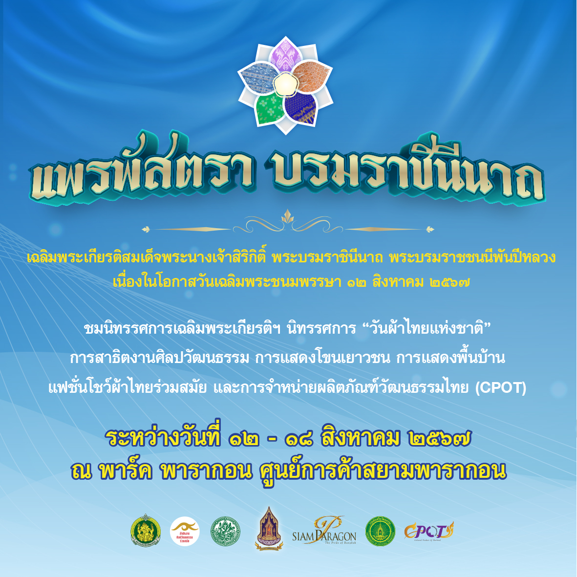 นางสาวสุดาวรรณ หวังศุภกิจโกศล รัฐมนตรีว่าการกระทรวงวัฒนธรรม กล่าวว่า กระทรวงวัฒนธรรม (วธ.) ร่วมกับศูนย์การค้าสยามพารากอนหน่วยงานรัฐ ภาคเอกชนและภาคีเครือข่ายทางวัฒนธรรม จัดงานเฉลิมพระเกียรติสมเด็จพระนางเจ้าสิริกิติ์ พระบรมราชินีนาถ พระบรมราชชนนีพันปีหลวง เนื่องในโอกาสวันเฉลิมพระชนมพรรษา 12 สิงหาคม 2567 ในชื่องาน “แพรพัสตรา บรมราชินีนาถ” ระหว่างวันที่ 12 – 18 สิงหาคม 2567 เวลา 11.00 – 21.00 น. โดยจะมีพิธีเปิดงานและพิธีถวายราชสักการะสมเด็จพระนางเจ้าสิริกิติ์ พระบรมราชินีนาถ พระบรมราชินีพันปีหลวง ในวันที่ 12 สิงหาคม 2567 เวลา 11.30 น. และในช่วงเย็น เวลา 19.00 ขอเชิญชวนเหล่าพสกนิกรร่วมจุดเทียนถวายพระพรชัยมงคลพร้อมกัน ณ พาร์ค พารากอน ชั้นเอ็ม ศูนย์การค้าสยามพารากอน กรุงเทพฯ โดยการจัดงานภายใต้ชื่องาน “แพรพัสตรา บรมราชินีนาถ” ในครั้งนี้ เพื่อน้อมสำนึกในพระมหากรุณาธิคุณของสมเด็จพระนางเจ้าสิริกิติ์ พระบรมราชินีนาถ พระบรมราชชนนีพันปีหลวงที่ทรงปฏิบัติพระราชกรณียกิจนานัปการเพื่อประโยชน์สุขของพสกนิกรชาวไทย ทรงอนุรักษ์ ฟื้นฟูศิลปวัฒนธรรมของชาติ ส่งเสริมงานหัตถศิลป์ และงานหัตถกรรมของไทย รวมถึงทรงอนุรักษ์ ส่งเสริมมรดกภูมิปัญญา “ผ้าไทย” ยกระดับผ้าไทยให้มีความโดดเด่นจนเป็นที่ประจักษ์แก่สายตานานาชาติ
