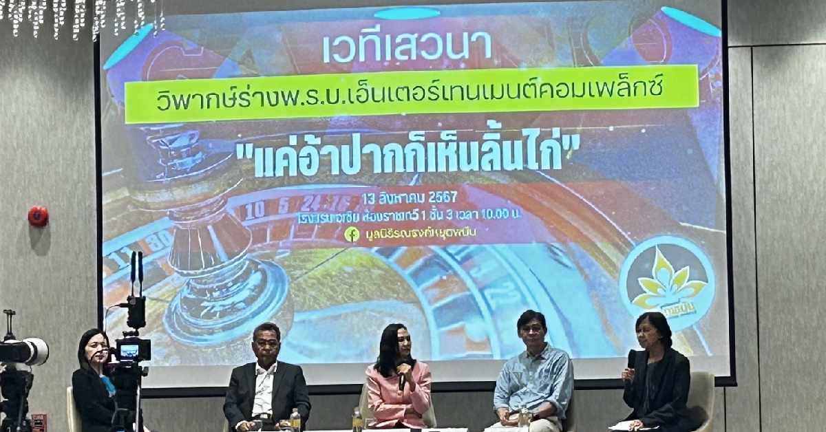 มูลนิธิรณรงค์หยุดพนัน จัดเสวนาวิพากษ์ร่าง พ.ร.บ.เอ็นเตอร์เทนเมนต์คอมเพล็กซ์ “แค่อ้าปากก็เห็นลิ้นไก่” โดยมี รศ.ดร.นวลน้อย ตรีรัตน์ ผู้อำนวยการศูนย์ศึกษาปัญหาการพนัน คณะเศรษฐศาสตร์ จุฬาลงกรณ์มหาวิทยาลัย , นายธนากร คมกฤส เลขาธิการมูลนิธิรณรงค์หยุดพนัน ,นายวิเชษฐ์ พิชัยรัตน์ สื่อมวลชนอาวุโส และ ผศ.ดร.ชิดตะวัน ชนะกุล นักวิชาการด้านเศรษฐศาสตร์ และตัวแทนภาคประชาชนเข้าร่วม