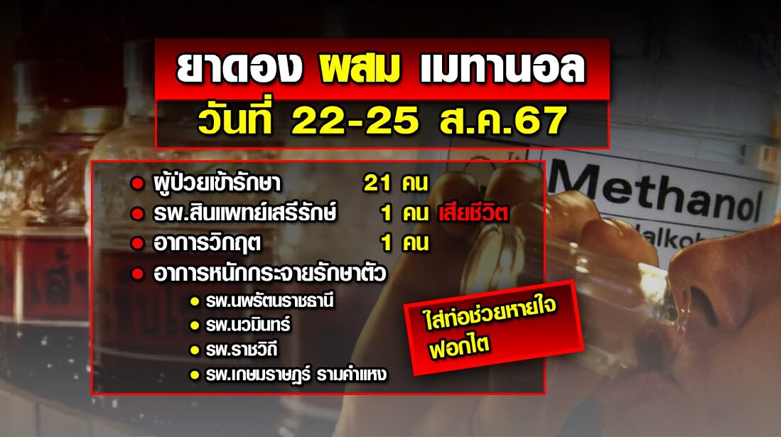 นพ.ไพโรจน์ สุรัตนวนิช รองอธิบดีกรมการแพทย์ พร้อมตัวแทนเจ้าหน้าที่จากกรมสรรพสามิต และตำรวจนครบาล 3 ร่วมประชุมติดตามความคืบหน้ากรณีมีประชาชนเสียชีวิต และเข้ารับการรักษาด้วยอาการ Methanol intoxication เป็นพิษเฉียบพลัน จากการดื่มสุราเถื่อน หรือเมทานอล จากซุ้มยาดอง ย่านหทัยราษฎร์ เขตมีนบุรี โดยระหว่างวันที่ 22-25 ส.ค.ที่ผ่านมา มีผู้ป่วยเข้ารับการรักษาด้วยอาการพิษจากเมทานอล 21 คน ในจำนวนนี้มี 1 คนที่ถูกส่งรักษาตัวที่ รพ. สินแพทย์เสรีรักษ์ เสียชีวิตแล้ว และอาการวิกฤติ 1 คน และยังมีคนไข้ที่เป็นสีแดง อีกจำนวนหนึ่งกระจายรักษาตัว ที่ รพ.นพรัตนราชธานี รพ.นวมินทร์ รพ.ราชวิถี รพ.เกษมราษฎร์รามคำแหง ส่วนใหญ่ผู้ป่วยที่เข้ารักษาตัว มาด้วยอาการเวียนศีรษะ ปวดท้อง คลื่นไส้อาเจียนรุนแรง หอบเหนื่อย ตาพร่ามัว บางรายต้องใส่ท่อช่วยหายใจ และต้องฟอกไต ทั้งนี้ หากผู้ป่วยรายใดอาการรุนแรง จะเจาะเลือดตรวจ ซึ่งปริมาณที่รับไปยังไม่ชัดเจน ต้องรอผลตรวจจากกรมวิทยาศาสตร์การแพทย์