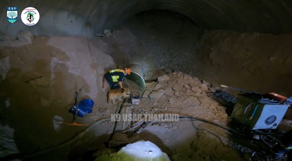 เพจ k9 USAR Thailand เผยคลิปขณะน้องสุนัขปฏิบัติหน้าที่จนสำเร็จ พบพิกัดของผู้สูญหายจากเหตุอุโมงค์โครงการก่อสร้างอุโมงค์รถไฟความเร็วสูง ช่วงสถานีรถไฟคลองขนานจิต ริมอ่างเก็บน้ำลำตะคอง อ.ปากช่อง จ.นครราชสีมา ทำให้คนงาน 3 ชีวิต ติดค้างภายใน