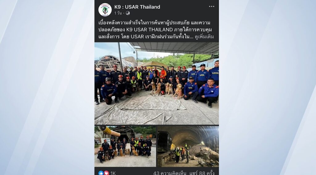 ก่อนหน้านี้ทางเพจ “K9 : USAR Thailand” ได้โพสต์คลิปวิดีโอขณะสุนัข k9 ปฏิบัติหน้าที่ พร้อมทั้งระบุข้อความว่า “เบื้องหลังความสำเร็จในการค้นหาผู้ประสบภัย และความปลอดภัยของ K9 USAR THAILAND ภายใต้การควบคุมและสั่งการโดย USAR เราฝึกฝนร่วมกันทั้งในประเทศและในต่างประเทศ กรมป้องกันและบรรเทาสาธารณภัยคือต้นสังกัดของ K9 USAR THAILAND ผู้ควบคุมสถานการณ์ ประเมิน และควบคุมความปลอดภัยให้กับทีม โดยมาตรฐานสากล หน่วยบัญชาการทหารพัฒนา ที่ให้คำแนะนำและข้อควรระวังในการปฏิบัติงาน ขอบคุณ อบต.จันทึก ในการอำนวยความสะดวกและอาหารสำหรับเจ้าหน้าที่ทุกนาย ขอบคุณทุกท่านที่สนับสนุน K9 USAR THAILAND มาตลอด พวกเราจะฝึกฝนอย่างเต็มที่เพื่อปฏิบัติการทางด้านมนุษยธรรมต่อไป”