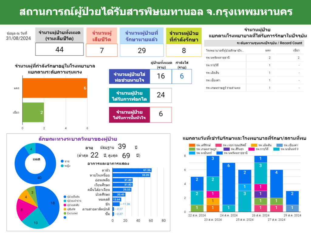 วันนี้ 31 ส.ค.67 เวลา 16.00 น. รายงานสถานการณ์ผู้ได้รับผลจากเมทานอลในสุราเถื่อน กรุงเทพฯ พบมีผู้ป่วยในระบบเพิ่มอีก 1 ราย รวมเป็น 44 ราย โดยผู้ป่วยเป็นเพศชาย ภูมิลำเนา จ.พะเยา มาเยี่ยมลูกที่ กทม. พบประวัตินำเหล้าจากซุ้มหทัยราษฎร์33 กลับไปพะเยา โดยดื่มครั้งสุดท้าย 28 ส.ค. มีอาการตาพร่า ต่อมาในวันที่ 29 ส.ค. มีอาการเหนื่อย จึงไปตรวจที่ รพ.เชียงคำ จ.พะเยา อาการเดียวกับผู้ป่วยรายอื่นที่ได้รับสารเมทานอล