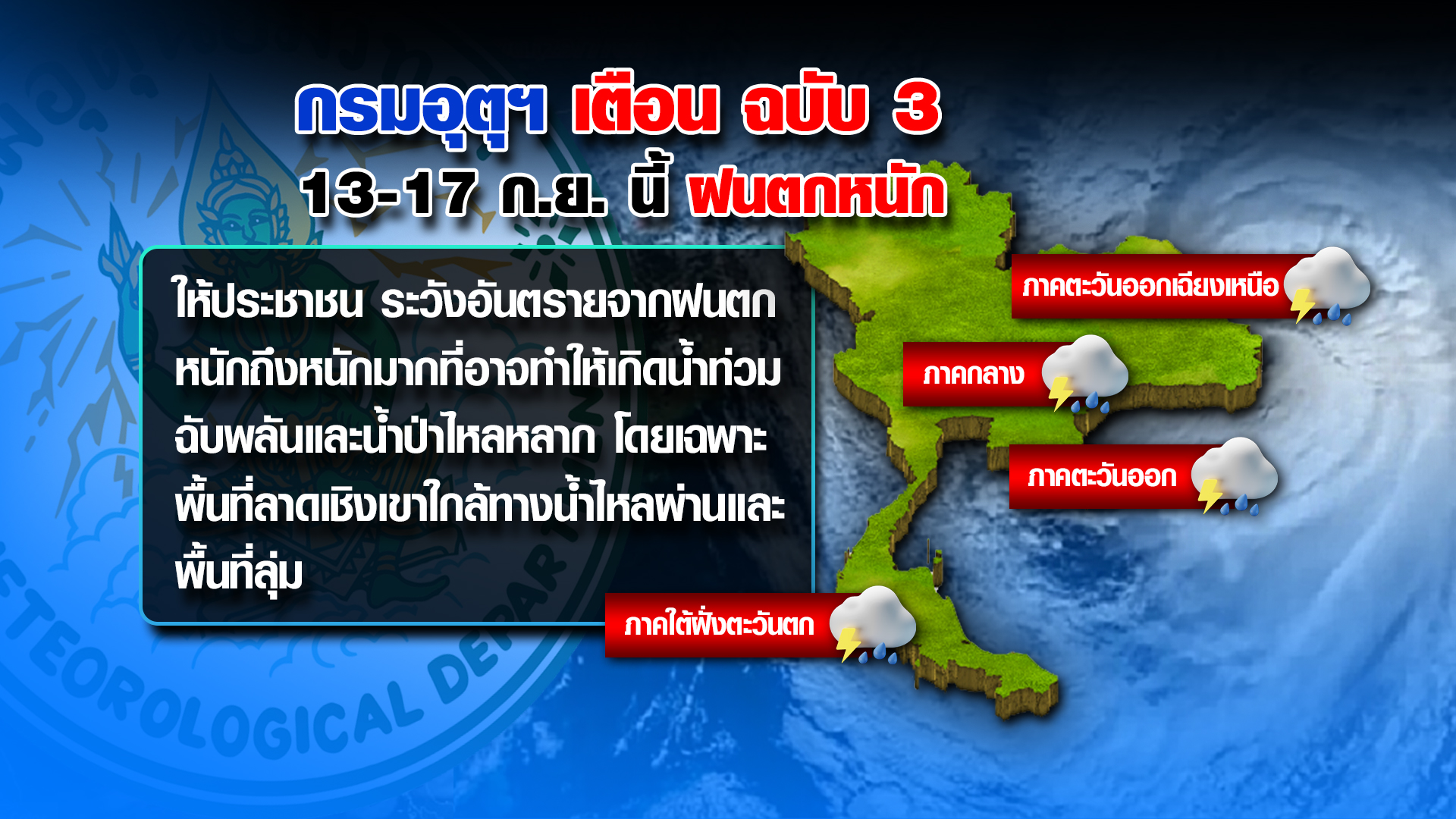กรมอุตุนิยมวิทยาออกประกาศเตือน ฉบับที่ 3 จะมีฝนเพิ่มขึ้นและตกหนักในช่วงวันที่ 13-17 ก.ย.นี้ หลายพื้นที่ บริเวณภาคตะวันออกเฉียงเหนือ ภาคกลาง ภาคตะวันออก ภาคใต้ฝั่งตะวันตก และฝนที่ตกสะสมอาจทำให้เกิด น้ำท่วมฉับพลันและน้ำป่าไหลหลาก โดยเฉพาะพื้นที่ลาดเชิงเขา