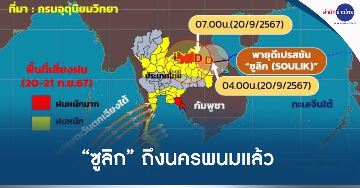 กทม. 20 ก.ย.-กรมอุตุฯ เผยพายุ “ซูลิก” เคลื่อนตัวเข้าสู่ประเทศไทย บริเวณ จ.นครพนม แล้ว เมื่อเวลา 07.00 น. คาดจะอ่อนกำลังลงเป็นหย่อมความกดอากาศต่ำกำลังแรงต่อไป อาจทำให้ปริมาณฝนไม่มากเท่าที่คาดการณ์ไว้ แต่ยังประมาทไม่ได้
