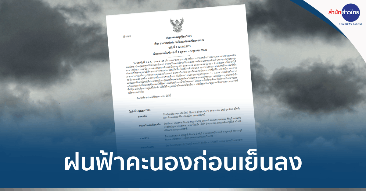 ประกาศกรมอุตุนิยมวิทยา เรื่อง อากาศแปรปรวนบริเวณประเทศไทยตอนบน ฉบับที่ 7 (219/2567) มีผลกระทบในช่วงวันที่ 1 ตุลาคม – 3 ตุลาคม 2567
