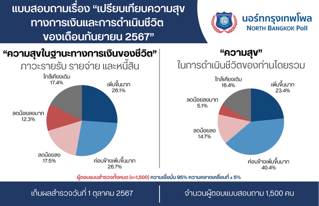 ดร.สานิต ศิริวิศิษฐ์กุล หัวหน้าศูนย์สำรวจความคิดเห็น “นอร์ทกรุงเทพโพล” มหาวิทยาลัยนอร์ทกรุงเทพ เปิดเผยว่าจากการสำรวจความคิดเห็นของประชาชน ในช่วงวันที่ 1 ตุลาคม 2567 โดยมีผู้สำรวจจำนวน 1,500 คน จากทั่วภูมิภาค ถึงเรื่อง “เปรียบเทียบความสุขทางการเงินและการดำเนินชีวิตประจำเดือน เดือนกันยายน 2567”
