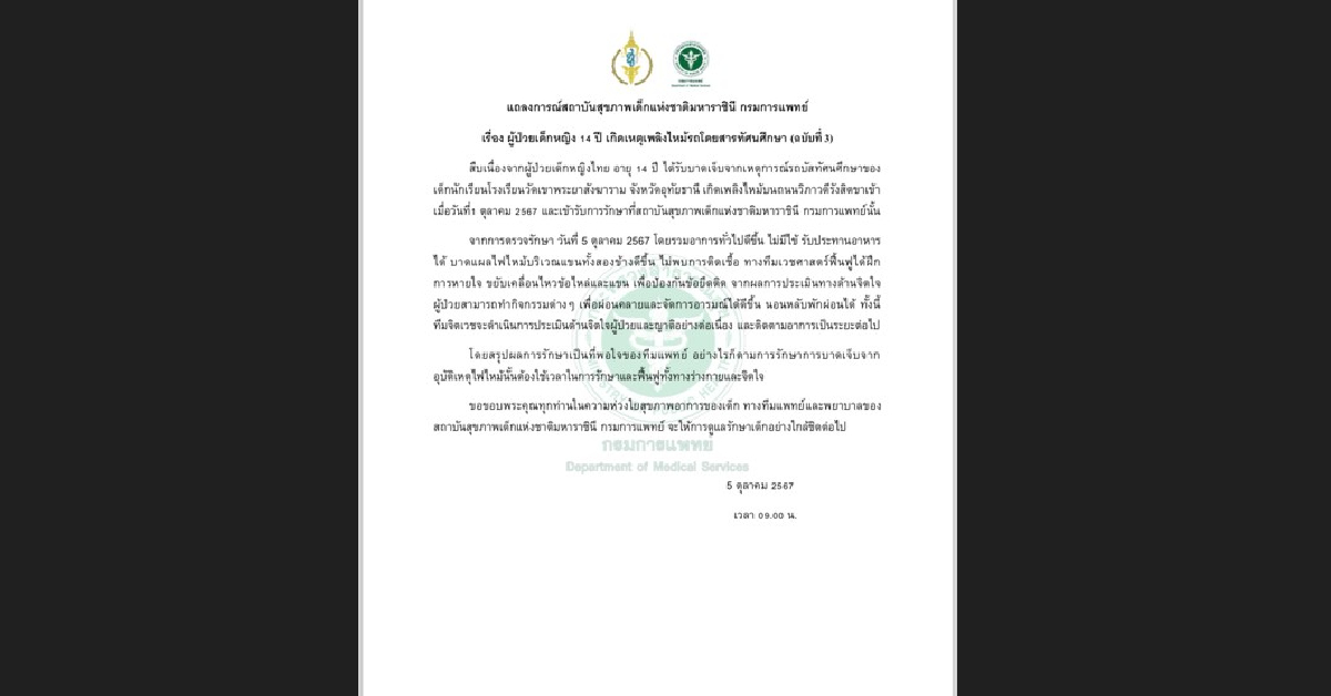 แถลงการณ์สถาบันสุขภาพเด็กแห่งชาติมหาราชินี กรมการแพทย์ เรื่องผู้ป่วยเด็กหญิง 14 ปี เกิดเหตุเพลิงไหม้รถโดยสารทัศนศึกษา (ฉบับที่ 3)