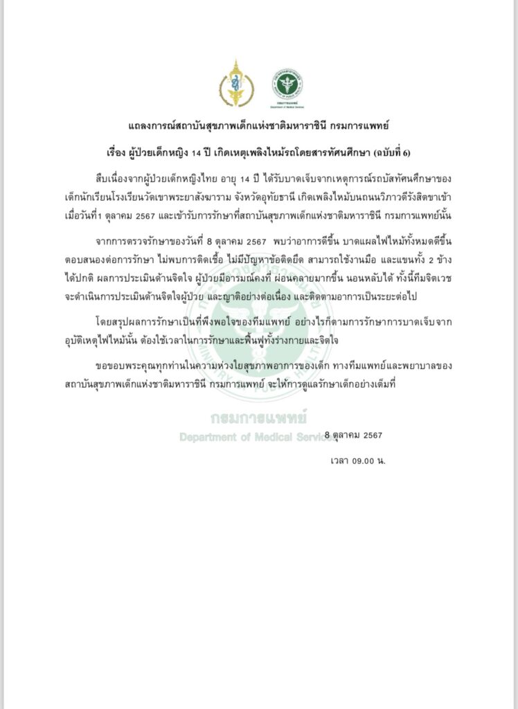 แถลงการณ์สถาบันสุขภาพเด็กแห่งชาติมหาราชินี กรมการแพทย์ เรื่อง ผู้ป่วยเด็กหญิง 14 ปี เกิดเหตุเพลิงไหม้รถโดยสารทัศนศึกษา (ฉบับที่ 6)