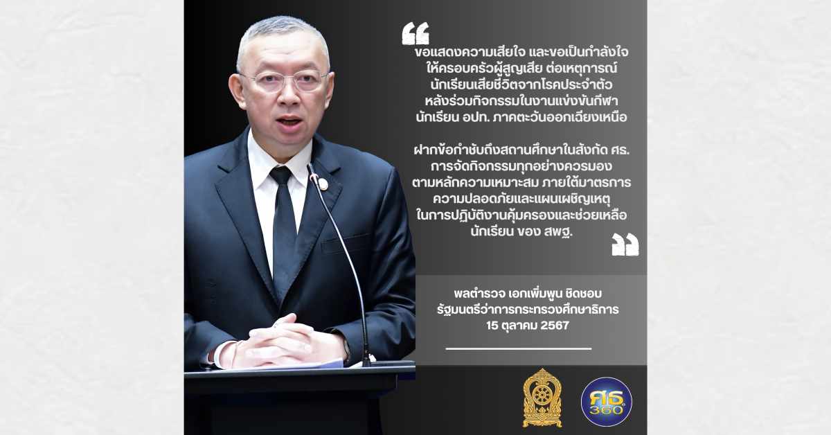 15 ต.ค. – “พล.ต.อ.เพิ่มพูน” รมว.ศึกษาธิการ แสดงความเสียใจต่อเหตุการณ์นักเรียนชั้นมัธยมศึกษาปีที่ 6 จังหวัดอุดรธานี เสียชีวิตจากโรคประจำตัวหลังร่วมกิจกรรมในงานแข่งขันกีฬานักเรียนองค์กรปกครองส่วนท้องถิ่นแห่งประเทศไทย ภาคตะวันออกเฉียงเหนือ
