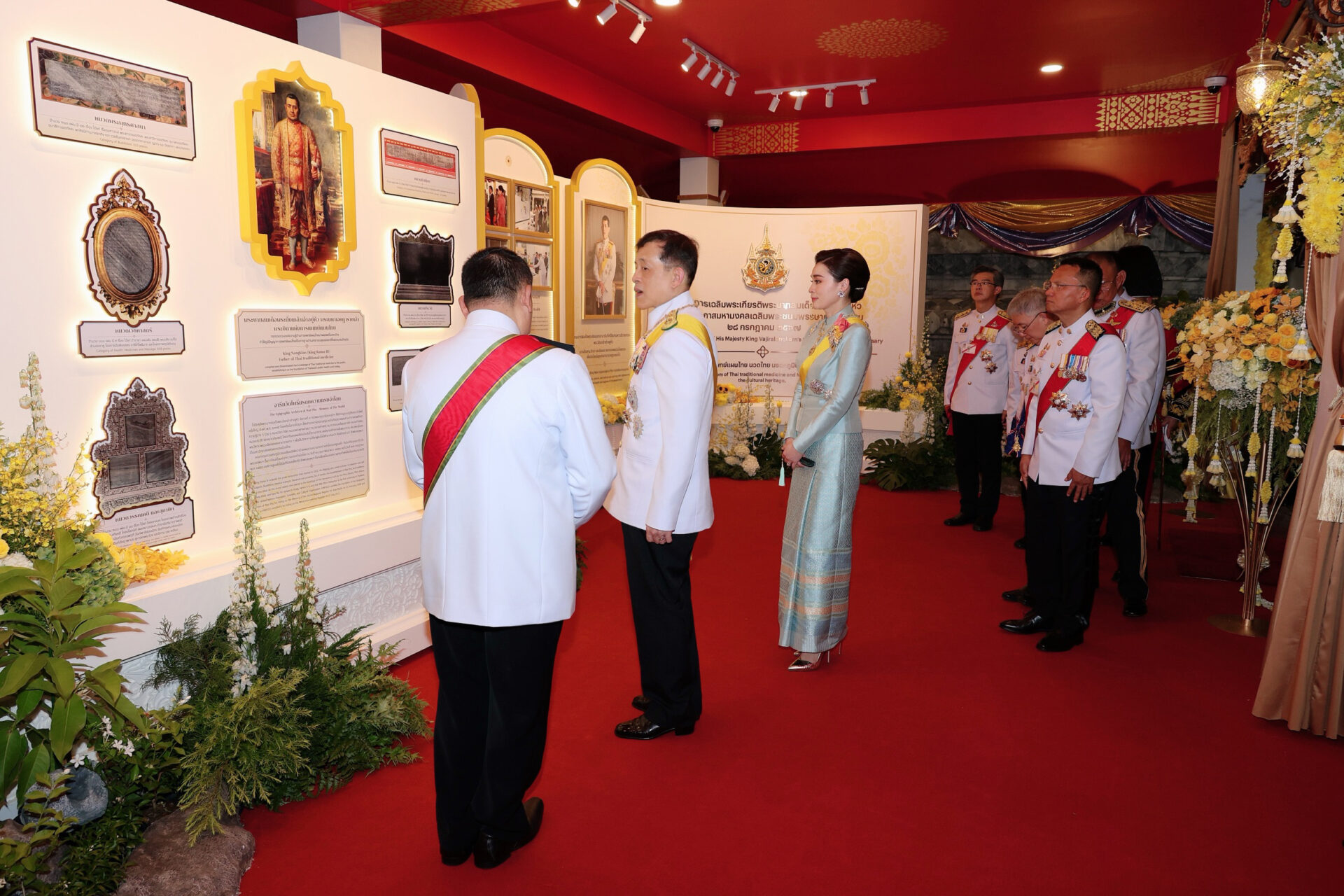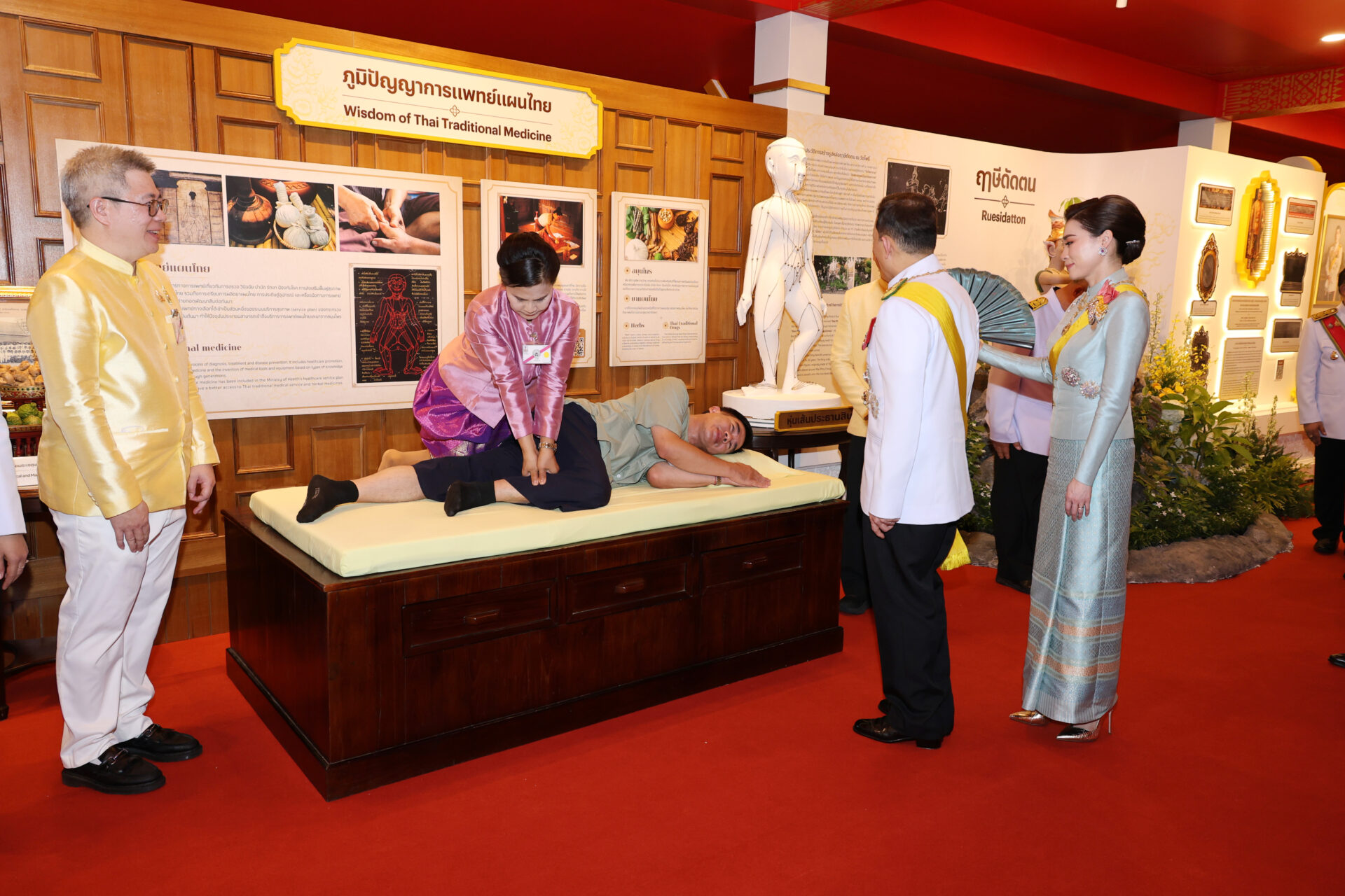 ในการนี้ พระราชทานพระบรมราชวโรกาสให้ผู้มีจิตศรัทธาบริจาคเงิน เฝ้าทูลละอองธุลีพระบาท รับพระราชทานของที่ระลึก เสร็จแล้ว เสด็จออกจากพระอุโบสถ แล้วเสด็จพระราชดำเนินไปลานเขตพุทธาวาส ทรงตัดแถบแพรเปิดงานสัปดาห์วันภูมิปัญญาการแพทย์แผนไทยแห่งชาติ และทอดพระเนตรนิทรรศการภูมิปัญญาการแพทย์แผนไทย ซึ่งจัดแสดงนิทรรศการเฉลิมพระเกียรติ พระราชกรณียกิจ และพระปรีชาสามารถด้านต่าง ๆ ของพระบาทสมเด็จพระนั่งเกล้าเจ้าอยู่หัว พระมหาเจษฎาราชเจ้า ในฐานะ “พระบิดาแห่งการแพทย์แผนไทย” นิทรรศการและการสาธิตองค์ความรู้ภูมิปัญญาการแพทย์แผนไทย การแพทย์พื้นบ้าน และสมุนไพร อัตลักษณ์ของแต่ละจังหวัด กับนิทรรศการผลสำเร็จการดำเนินงานด้านการแพทย์แผนไทย และการแพทย์พื้นบ้านของหน่วยงานราชการ หน่วยงานในสังกัดกระทรวงสาธารณสุข ชมรม สมาคม และมูลนิธิต่าง ๆ