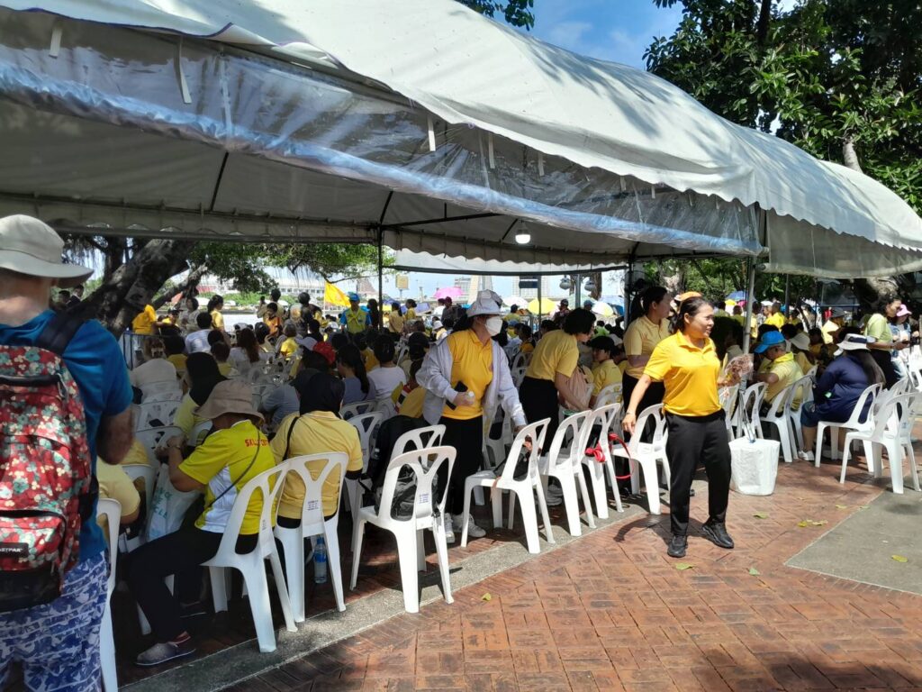 บรรยากาศที่สวนสันติชัยปราการ ถนนพระอาทิตย์ ประชาชนจำนวนมากสวมใส่เสื้อเหลือง จับจองพื้นที่ที่ทางกรุงเทพมหานคร และหน่วยงานที่เกี่ยวข้อง จัดเตรียมไว้อำนวยความสะดวกให้กับประชาชน รวมถึงสื่อมวลชน ร่วมชมขบวนพยุหยาตราทางชลมารค และชมพระบารมีของพระบาทสมเด็จพระเจ้าอยู่หัว จนเต็มพื้นที่หมดแล้ว