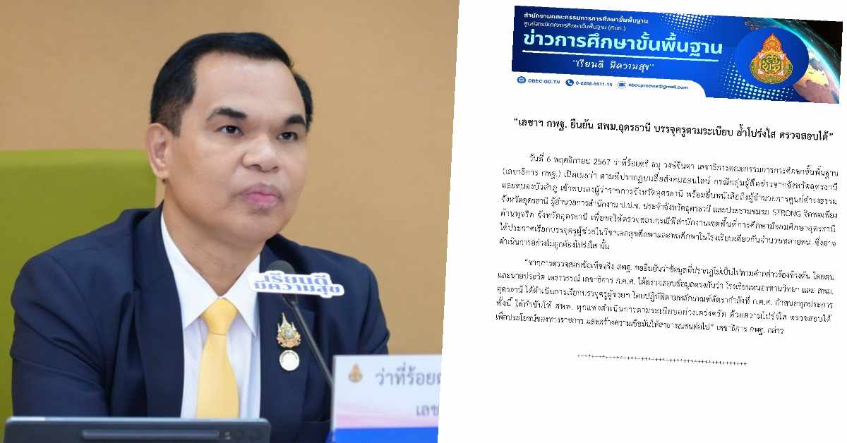 ศธ. 6 พ.ย. – เลขาฯ กพฐ.ยืนยัน สพม.อุดรธานี บรรจุครูผู้ช่วยตามระเบียบ ย้ำโปร่งใส ตรวจสอบได้ หลังมีการยื่นหนังสือขอให้ตรวจสอบ