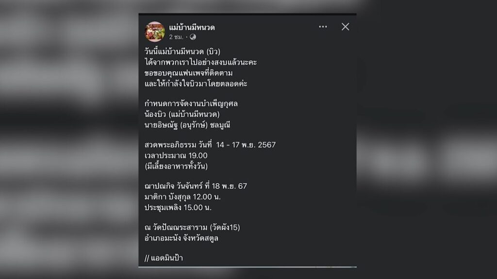 13 พ.ย. – ครอบครัวแจ้งข่าวเศร้า “แม่บ้านมีหนวด” อินฟลูฯ คนดัง เสียชีวิต ในวัย 34 ปี