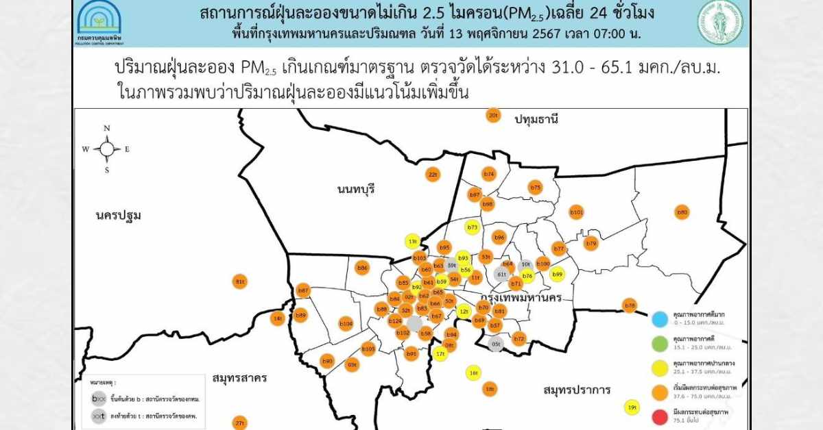 ศูนย์สื่อสารการแก้ไขปัญหามลพิษทางอากาศ รายงานการติดตามตรวจสอบคุณภาพอากาศประจำวันที่ 13 พฤศจิกายน 2567 เวลา 07.00 น. ภาพรวมปริมาณ PM2.5 ในประเทศพบเกินค่ามาตรฐานใน 12 จังหวัด ได้แก่ จ.ปทุมธานี กรุงเทพฯ จ.นนทบุรี จ.นครปฐม จ.สมุทรสาคร จ.สมุทรปราการ จ.น่าน จ.สิงห์บุรี จ.สระบุรี จ.อ่างทอง จ.กาญจนบุรี และ จ.ฉะเชิงเทรา