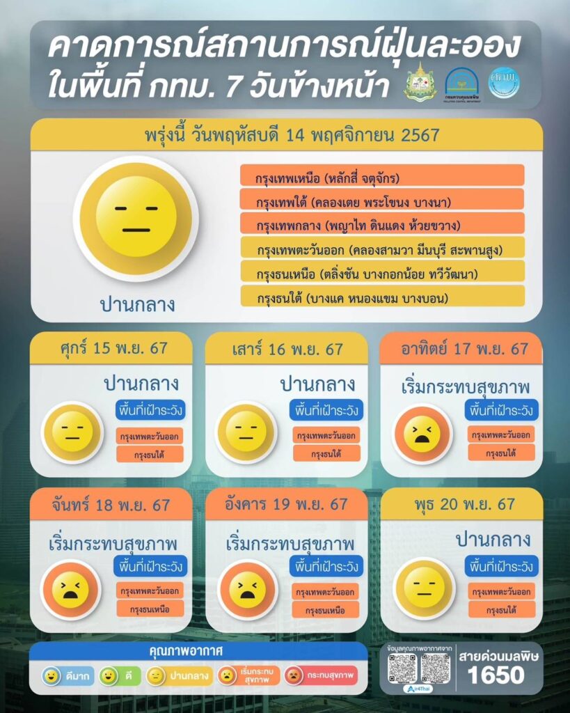 ส่วนผลการคาดการณ์สถานการณ์ฝุ่นละอองล่วงหน้า มีดังนี้ พื้นที่ กทม.และปริมณฑล มีแนวโน้มเพิ่มขึ้นวันที่ 17 – 19 พ.ย. 2567 และยังคงต้องเฝ้าระวังในบางพื้นที่ ส่วน 17 จังหวัดภาคเหนือ ดีอย่างต่อเนื่อง และยังคงต้องเฝ้าระวังในบางพื้นที่, ภาคตะวันออกเฉียงเหนือ มีแนวโน้มเพิ่มขึ้นวันที่ 14 – 20 พ.ย. 2567, ภาคตะวันออก มีแนวโน้มลดลงวันที่ 14 – 20 พ.ย. 2567 และดีมากอย่างต่อเนื่อง และภาคใต้ ดีมากอย่างต่อเนื่อง. -512 – สำนักข่าวไทย