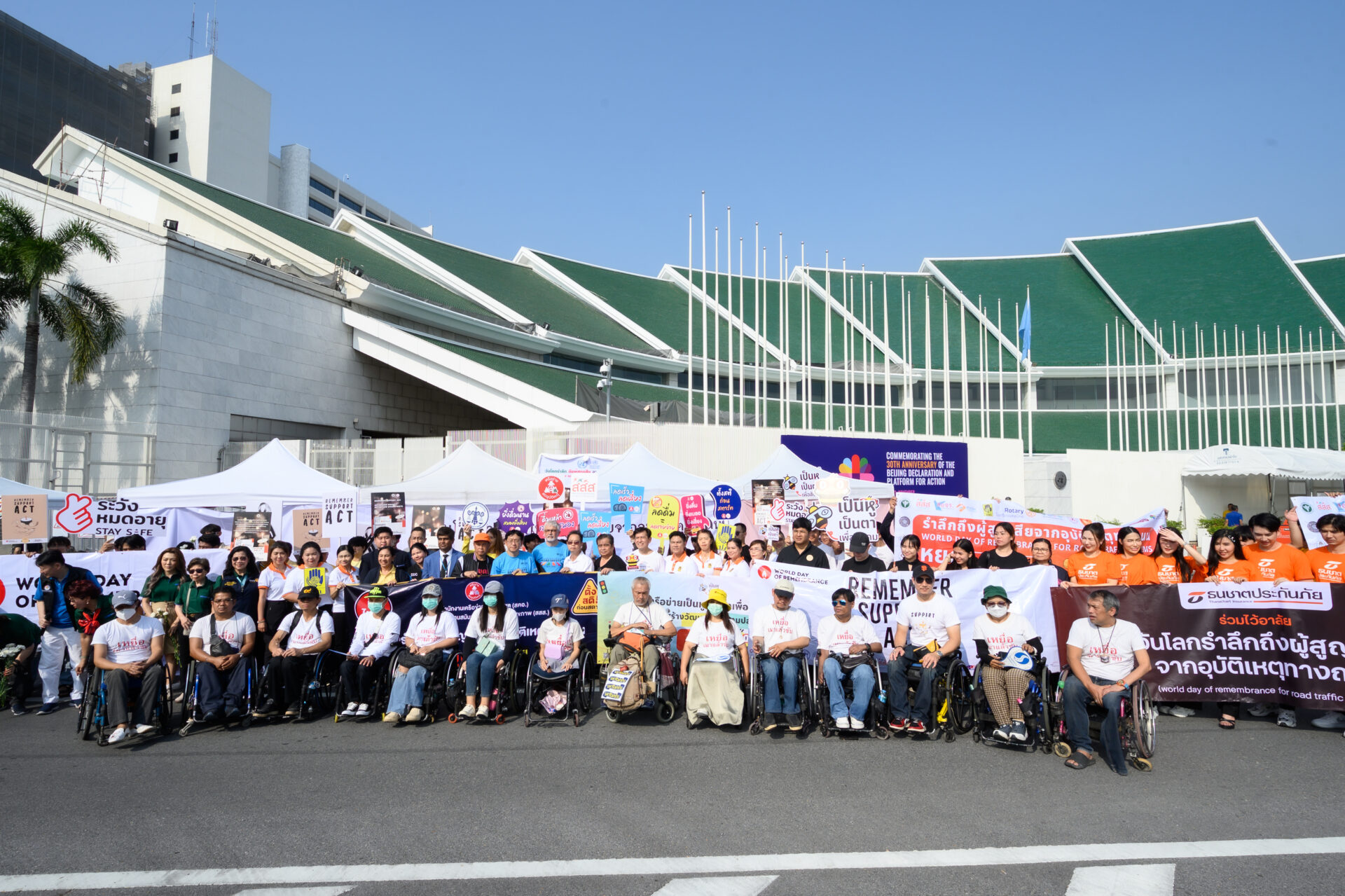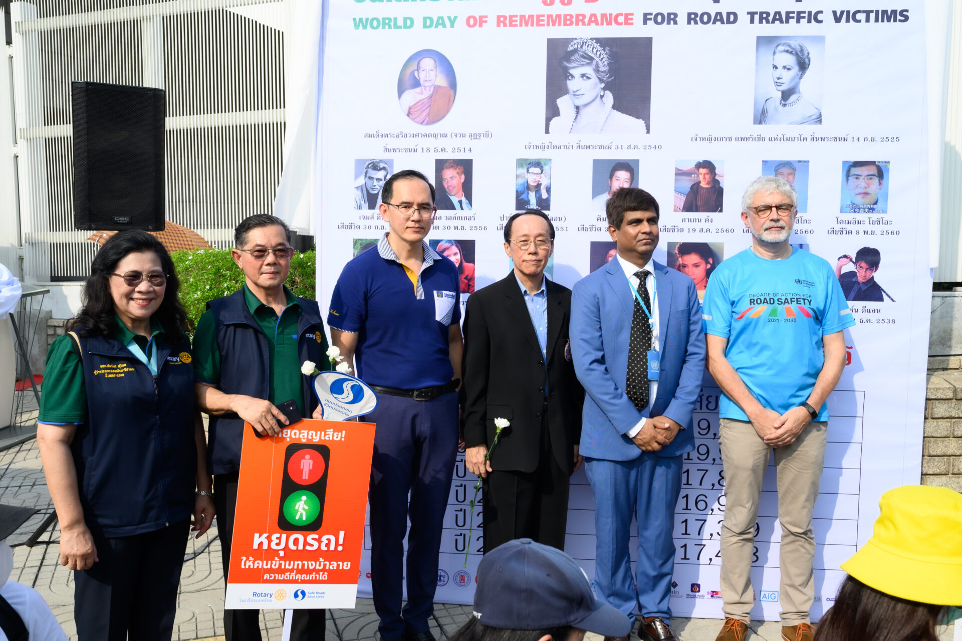 ที่บริเวณหน้าสำนักงานองค์การสหประชาชาติประจำประเทศไทย ถนนราชดำเนิน กรุงเทพฯ มูลนิธิเมาไม่ขับ ร่วมกับ สำนักงานกองทุนสนับสนุนการสร้างเสริมสุขภาพ (สสส.) กรุงเทพมหานคร กรมป้องกันและบรรเทาสาธารณภัย กระทรวงสาธารณสุข สำนักงานตำรวจแห่งชาติ สโมสรโรตารีประเทศไทย ภาคีเครือข่ายรณรงค์ลดอุบัติเหตุภาครัฐ ภาคเอกชน ได้ร่วมกันจัดงานวันโลกรำลึกถึงผู้สูญเสียจากอุบัติเหตุทางถนน (World Day of Remembrance for Road Traffic Victims) ขึ้น โดยมีบุคคลสำคัญจากองค์กรทั้งในประเทศและต่างประเทศมาร่วมงาน อาทิเช่น นายสุรชัย เลี้ยงบุญเลิศชัย ที่ปรึกษาคณะกรรมการพิจารณาศึกษาแนวทางการป้องกันและลดอุบัติเหตุเพื่อสร้างความปลอดภัยทางถนน รัฐสภา, ดร.ชัชชาติ สิทธิพันธุ์ ผู้ว่าราชการกรุงเทพมหานคร, HE. Mr. Jean-Claude Poimbœuf เอกอัครราชทูตฝรั่งเศสประจำประเทศไทย, นายนิกร จำนง ประธานกรรมการมูลนิธิประชาปลอดภัย, Mr. Ishtiaque Ahmed, Economic Affairs Officer, Sustainable Transport Section, Transport Division, UNESCAP ผู้แทน UNESCAP, Thailand, Dr Jos Vandelaer ผู้แทนองค์การอนามัยโลกประจำประเทศไทย, Mr.Dave Thomas อุปทูตรักษาการแทนเอกอัครราชทูตอังกฤษประจำประเทศไทย, นางสาวภัทร์ศรี สุวิมล ผู้ว่าการโรตารี ภาค 3350 ผู้แทนโรตารีประเทศไทย, นายปรีชา กลิ่นแก้ว เลขาธิการโครงการถนนปลอดเหตุ ชีวิตปลอดภัย โรตารีประเทศไทย, นางรัชนี สุภวัตรจริยากุล (คุณแม่หมอกระต่าย), นายมหาโภคัย ขำกระแสร์ บิดาเด็กชายณัฐพงศ์ ขำกระแสร์ ครอบครัวเหยื่อรถบัสนักเรียน จังหวัดอุทัยธานี, นายอนุสรณ์ แก้วใจ (บิดา) นางสุจิตร รอดจิตร์ (มารดา) (เด็กชายสิริณัฏฐ์ แก้วใจ) ครอบครัวเหยื่อรถบัสนักเรียน จังหวัดอุทัยธานี, นายแพทย์แท้จริง ศิริพานิช เลขาธิการมูลนิธิเมาไม่ขับ, ดร.อุดม หงส์ชาติกุล ผู้ก่อตั้ง Social Lab Thailand, นางสาววารุณี ซื่อสัตย์สกุลชัย ผู้จัดการแผนกกิจกรรมเพื่อสังคม บริษัท วิริยะประกันภัยจำกัด (มหาชน ), ผู้ช่วยกรรมการผู้จัดการ บริษัท กลางคุ้มครองผู้ประสบภัยจากรถ จำกัด, เรืออากาศเอกนายแพทย์อัจฉริยะ แพงมา เลขาธิการสถาบันการแพทย์ฉุกเฉิน, ผู้แทนมูลนิธิป่อเต็กตึ๊ง, ผู้แทนมูลนิธิร่วมกตัญูญู, ผู้แทนสำนักงานเครือข่ายลดอุบัติเหตุ (สคอ.), ผู้แทนสำนักงานคุมประพฤติกรุงเทพมหานคร 2 แขกผู้มีเกียรติ พร้อมด้วยเหยื่อเมาแล้วขับผู้สูญเสีย มาร่วมงานเป็นจำนวนมาก