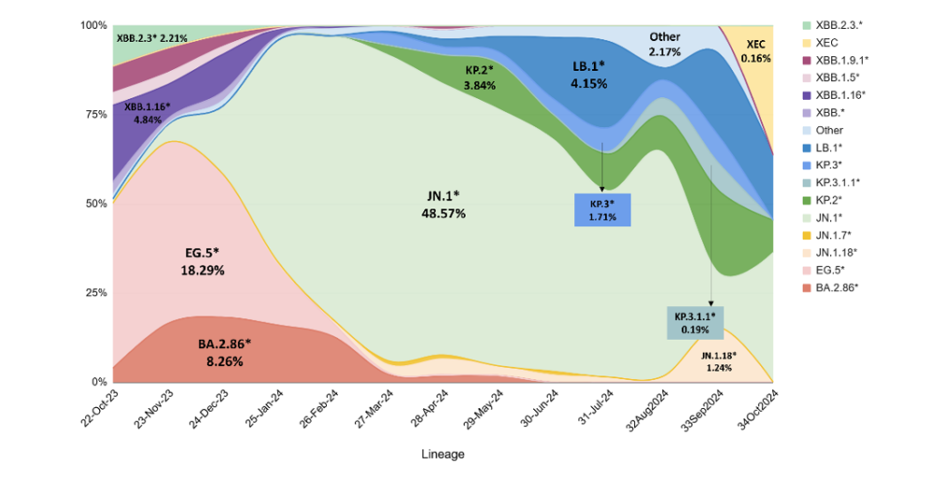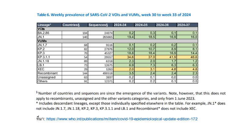 จากฐานข้อมูลกลาง GISAID ระหว่างวันที่ 19 สิงหาคมถึงวันที่ 15 กันยายน 2567 พบว่า KP.3.1.1* (สายพันธุ์ย่อยของ KP.3) พบมากที่สุด ในสัดส่วน 46.6%โดยมีอัตราการพบที่เพิ่มขึ้นอย่างต่อเนื่อง JN.1 พบสัดส่วน 16% มีอัตราการพบที่ลดลงต่อเนื่อง สายพันธุ์ KP.3, KP.2, LB.1, JN.1.18, JN.1.7* มีแนวโน้มลดลง โดย KP.3* คิดเป็น 14.4%, KP.2* คิดเป็น 8.1%, LB.1* คิดเป็น 6.3%, JN.1.18* คิดเป็น 1.2% และ JN.1.17* คิดเป็น 0.1%ตามลำดับ,สายพันธุ์ XEC มีแนวโน้มเพิ่มขึ้น ในสัดส่วน 4.8%และสายพันธุ์ Recombinant มีอัตราส่วนการพบเพิ่มขึ้นในสัดส่วน 2.3%