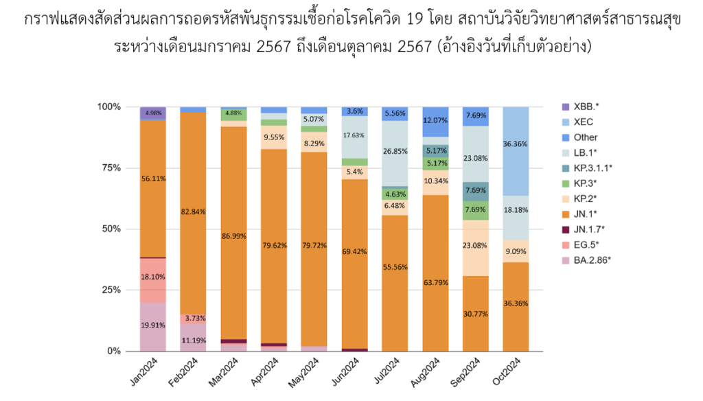 สำหรับข้อมูลการถอดรหัสพันธุกรรมเชื้อก่อโรคโควิด 19 จากห้องปฏิบัติการฝ่ายไวรัสระบบทางเดินหายใจ สถาบันวิจัยวิทยาศาสตร์สาธารณสุขกรมวิทยาศาสตร์การแพทย์ระหว่างวันที่ 23 กันยายนถึงวันที่ 25 ตุลาคม 2567 จำนวน 69รายพบสายพันธุ์ JN.1* จำนวน 25 ราย คิดเป็นสัดส่วน 36.2% สายพันธุ์KP.2* (สายพันธุ์ย่อยของ JN.1.11.1) จำนวน 17 ราย คิดเป็นสัดส่วน 24.6% จำนวน 9 ราย คิดเป็นสัดส่วน 13.0%, สายพันธุ์ XEC (สายพันธุ์ลูกผสมของ KS.1.1 และ KP.3.3) จำนวน 4 ราย คิดเป็นสัดส่วน 5.8% ซี่งพบในเขตสุขภาพที่ 4 และ 13 , สายพันธุ์ KP.3 (สายพันธุ์ย่อยของ JN.1.11.1), KP.3.1.1 (สายพันธุ์ย่อยของ JN.1.11.1) และ JN.1.18 จำนวนสายพันธุ์ละ 3 ราย คิดเป็นสัดส่วนสายพันธุ์ละ 4.3% .-สำนักข่าวไทย