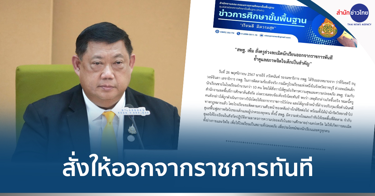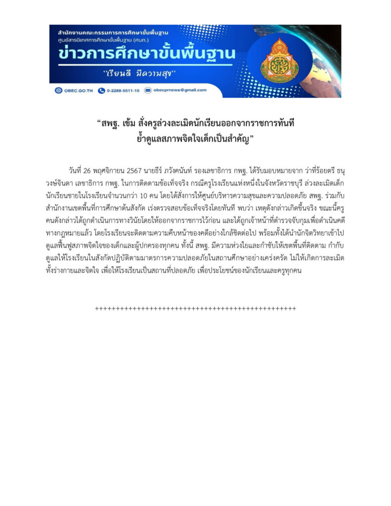 26 พ.ย.- สพฐ. สั่งให้ครูล่วงละเมิดนักเรียนชายในโรงเรียนราชบุรี กว่า 10 คน ออกจากราชการทันที เข้มดำเนินคดีตามกฎหมาย ส่งทีมดูแลสภาพจิตใจเด็ก