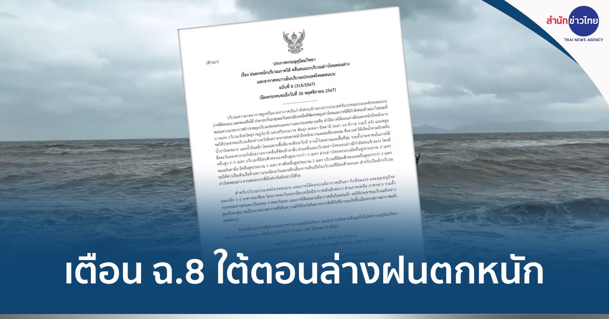 ประกาศกรมอุตุนิยมวิทยา เรื่อง ฝนตกหนักบริเวณภาคใต้ คลื่นลมแรงบริเวณอ่าวไทยตอนล่าง และอากาศหนาวเย็นบริเวณประเทศไทยตอนบน ฉบับที่ 8 (315/2567) มีผลกระทบจนถึงวันที่ 30 พฤศจิกายน 2567