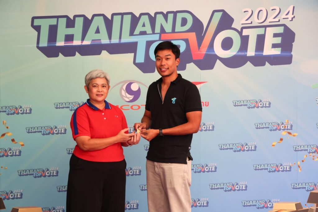 นายผาติยุทธ ใจสว่าง รักษาการในตำแหน่งผู้อำนวยการใหญ่ บมจ.อสมท พร้อมด้วย นางสาวนวรัตน์ อัจฉริยวงศ์เมธี ผู้ช่วยผู้จัดการฝ่ายโพสต์เน็กซ์ บริษัท ไปรษณีย์ไทย จำกัด ร่วมกิจกรรมมอบทองคำ ให้แก่ Top Spender 10 อันดับ ที่ร่วมโหวตรางวัล Thailand Top Vote 2024 ในสัปดาห์ที่ 5 (16-22 ธ.ค.)