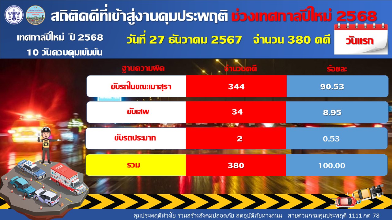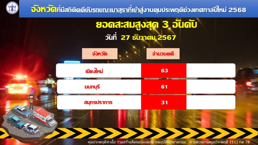 กทม. 28 ธ.ค.-วันแรกรณรงค์ป้องกันและลดอุบัติเหตุ ช่วงเทศกาลปีใหม่ 2568 มีคดีที่ศาลสั่งคุมความประพฤติทั้งสิ้น 380 คดี เมาแล้วขับถึง 344 คดี เทียบกับปีที่แล้ว พบลดลง 171 คดี จังหวัดที่มีสถิติคดีเมาแล้วขับสูงสุด 3 อันดับ ได้แก่ เชียงใหม่ 63 คดี นนทบุรี 61 คดี และสมุทรปราการ 31 คดี