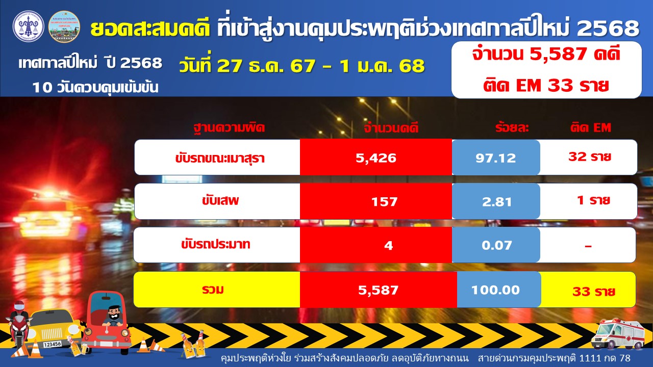 สรุปยอดสะสม 6 วันที่มีการควบคุมเข้มงวด ตั้งแต่วันที่ 27 ธันวาคม 2567 – 1 มกราคม 2568 มีคดีคุมประพฤติรวม 5,587 คดี ยอดติด EM สะสม 33 ราย ดังนี้: