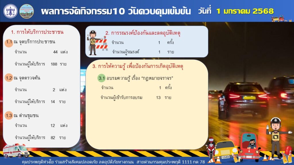 2 ม.ค.- 6 วันยอดพุ่ง กทม. เชียงใหม่ เมาขับต้อนรับปีใหม่ ทะลุ 800 คดี คุมประพฤติสกลนครเข้มติด EM คดีเมาขับ ขณะประจวบฯ นำผู้ถูกคุมความประพฤติร่วมกับตำรวจสังเกตการณ์จราจรและพฤติกรรมการขับขี่ ผ่านกล้อง CCTV สร้างความตระหนักรู้ขับขี่ปลอดภัย