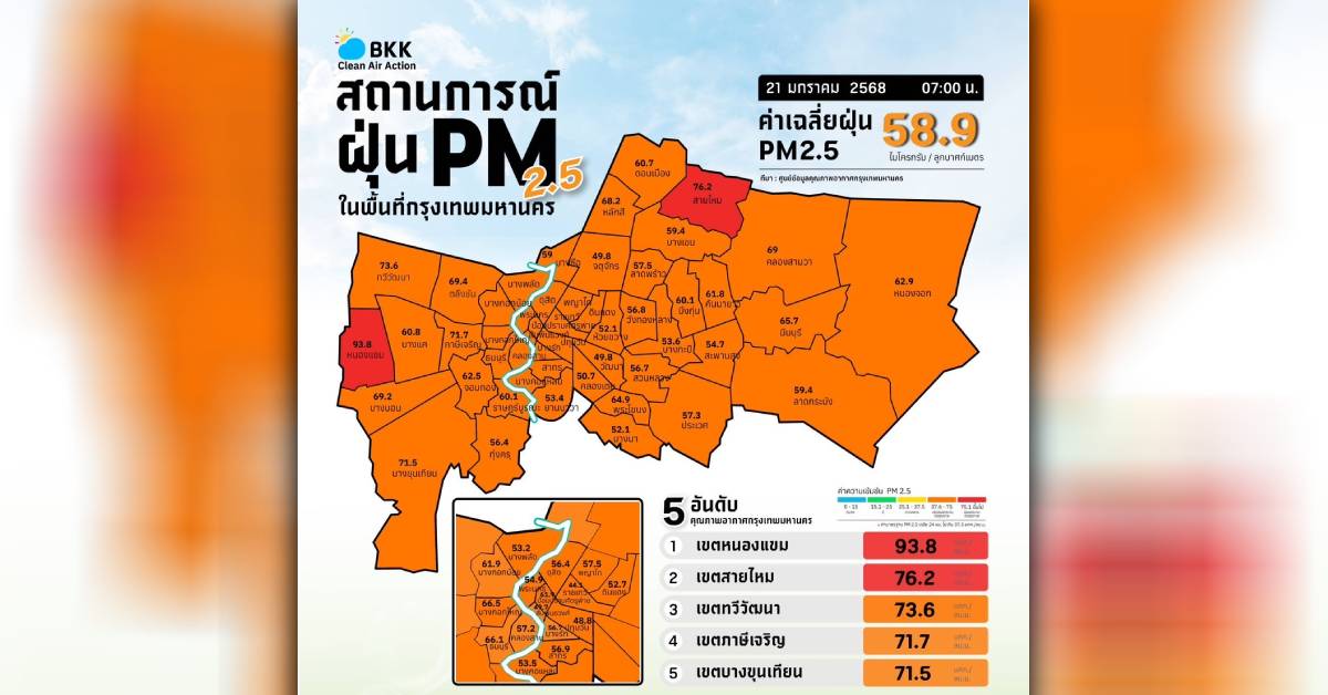 กทม. 21 ม.ค.-เช้านี้คุณภาพอากาศ กทม. ฝุ่น PM 2.5 อยู่ระดับสีแดง มีผลกระทบต่อสุขภาพ 3 พื้นที่ สีส้ม เริ่มมีผลกระทบต่อสุขภาพ 67 พื้นที่ ย้ำสวมหน้ากากอนามัยและลดกิจกรรมกลางแจ้ง