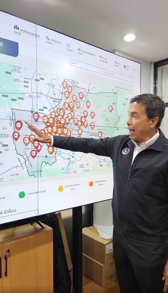 นายชัชชาติ สิทธิพันธุ์ ผู้ว่าฯ กทม. พร้อมด้วย นายพรพรหม วิกิตเศรษฐ์ ที่ปรึกษาของผู้ว่าฯ กทม. และผู้บริหารด้านความยั่งยืนของกรุงเทพมหานคร ติดตามสถานการณ์ฝุ่น PM2.5 ในพื้นที่กรุงเทพฯ ณ ศูนย์ข้อมูลคุณภาพอากาศกรุงเทพมหานคร สำนักสิ่งแวดล้อม เขตดินแดง
