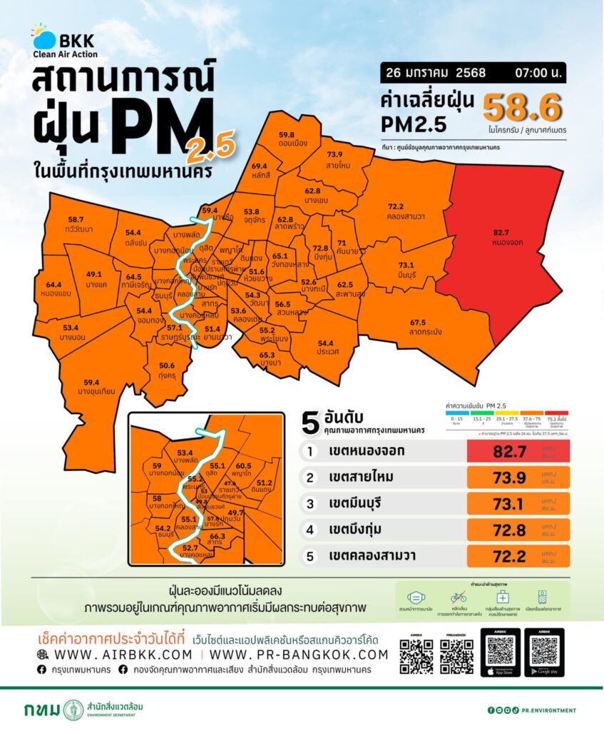 ขณะที่ศูนย์ข้อมูลคุณภาพอากาศกรุงเทพมหานคร สรุปผลการตรวจวัด PM 2.5 เช้านี้ พบเกินมาตรฐานอยู่ในระดับสีแดง มีผลต่อสุขภาพ จำนวน 4 พื้นที่ สูงสุดที่เขตหนองจอก วัดได้ 82.7 ไมโครกรัม/ลูกบาศก์เมตร และเกินมาตรฐานในระดับสีส้ม เริ่มมีผลกระทบต่อสุขภาพ จำนวน 66 พื้นที่.-สำนักข่าวไทย
