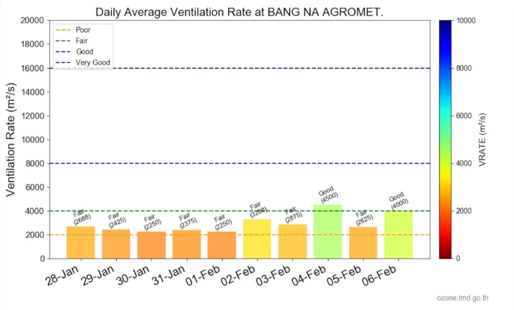ทั้งนี้ จากการคาดการณ์แนวโน้มสภาพอากาศที่ส่งผลกระทบต่อฝุ่น PM2.5 ในช่วงวันที่ 29 ม.ค. – 3 ก.พ.68 การระบายอากาศอยู่ในเกณฑ์ “อ่อน” ประกอบกับมีการเกิดอินเวอร์ชั่นใกล้ผิวพื้นอย่างต่อเนื่อง ทำให้มลพิษทางอากาศแพร่กระจายได้อย่างจำกัด ส่งผลให้ความเข้มข้นของฝุ่นละอองมีแนวโน้มทรงตัวถึงเพิ่มขึ้นในช่วงดังกล่าว โดยคาดการณ์ว่าค่าฝุ่น PM2.5 ในพื้นที่ กทม. 7 วันข้างหน้า ช่วงวันที่ 30 ม.ค.-5 ก.พ.68 มีแนวโน้มเพิ่มขึ้น ส่งผลกระทบต่อสุขภาพ