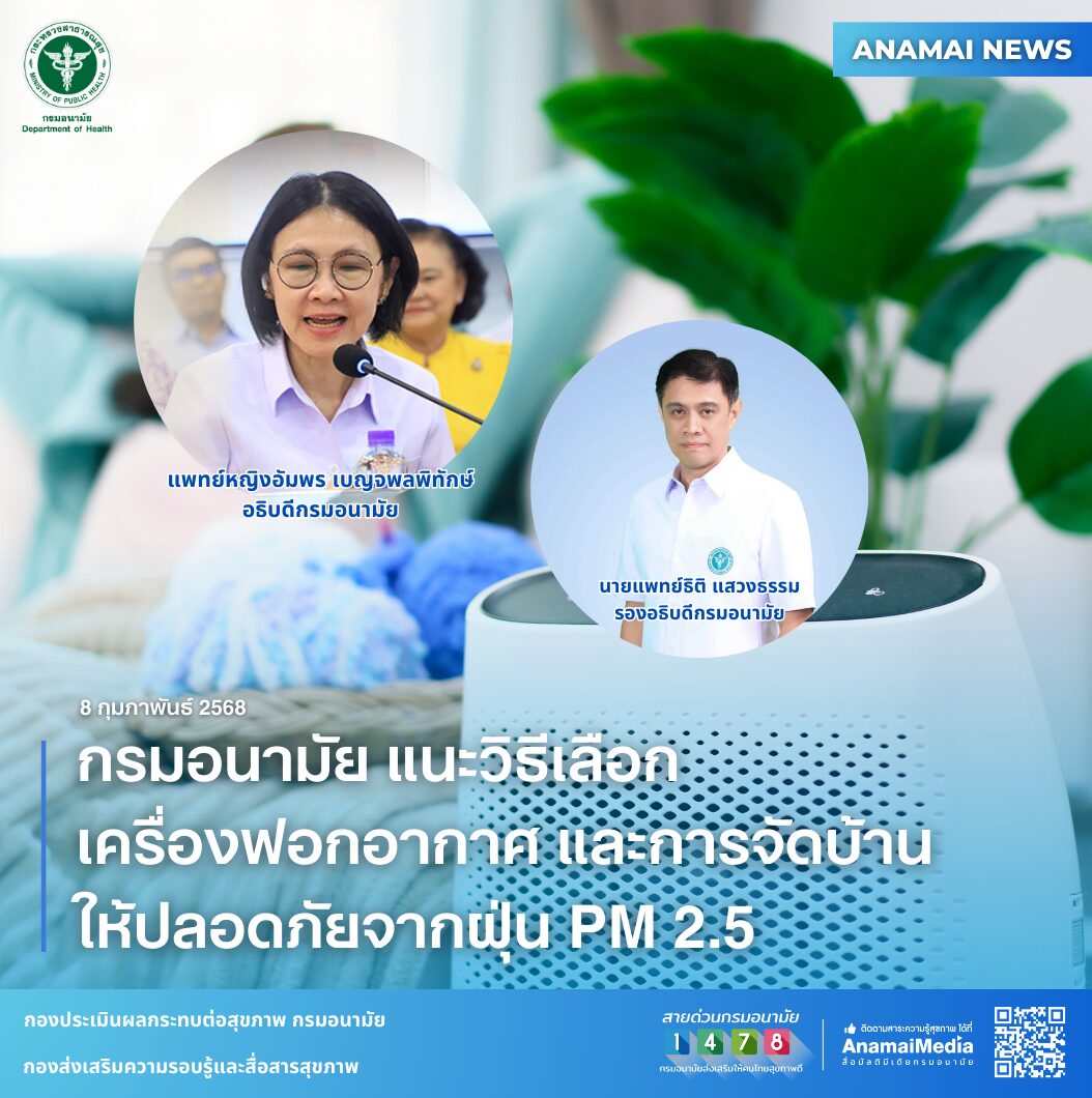 แพทย์หญิง อัมพร เบญจพลพิทักษ์ อธิบดีกรมอนามัย เปิดเผยว่า ในช่วงที่ผ่านมาสถานการณ์ฝุ่น PM 2.5 มีค่าเกินมาตรฐานเกือบทุกพื้นที่ และจากการคาดการณ์ของกรมควบคุมมลพิษ ระหว่างวันที่ 7-13 กุมภาพันธ์ 2568 ยังพบว่าสถานการณ์ฝุ่น PM 2.5 จะมีแนวโน้มเพิ่มขึ้น โดยอยู่ในระดับที่เริ่มมีผลกระทบต่อสุขภาพ หรือระดับสีส้ม (37.6-75.0 ไมโครกรัมต่อลูกบาศก์เมตร) ซึ่งกลุ่มเสี่ยงที่จะได้รับผลกระทบมากคือ เด็ก หญิงตั้งครรภ์ ผู้สูงอายุ และผู้ที่มีโรคประจำตัว เช่น โรคระบบทางเดินหายใจ หอบหืด เป็นต้น เนื่องจากมีความอ่อนไหวมากกว่าประชาชนทั่วไป เครื่องฟอกอากาศจึงกลายเป็นปัจจัยหนึ่งในการช่วยลดฝุ่น PM 2.5 ภายในอาคาร