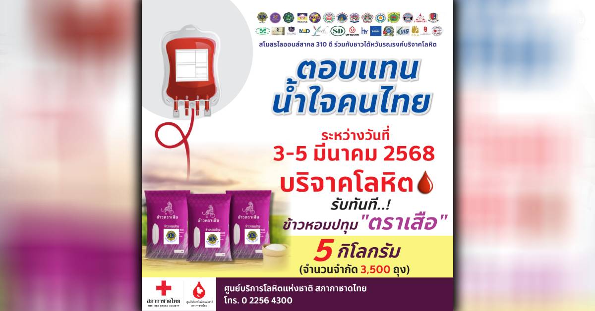 ศูนย์บริการโลหิตแห่งชาติ จึงร่วมกับ สโมสรไลออนส์สากล 310 ดี และกลุ่มชาวไต้หวันรณรงค์ บริจาคโลหิต มอบข้าวหอมปทุม “ตราเสือ” จำนวน 3,500 ถุง ให้กับผู้บริจาคโลหิตที่มีสุขภาพร่างกายแข็งแรง ระหว่างวันที่ 3 – 5 มีนาคม 2568 ณ ศูนย์บริการโลหิตแห่งชาติ สภากาชาดไทย ร่วมบริจาคโลหิตช่วยชีวิตเพื่อนมนุษย์ เพื่อสำรองโลหิตคงคลังให้เพียงพอกับโรงพยาบาลต่างๆ ทั่วประเทศ ของที่ระลึกมีจำนวนจำกัด