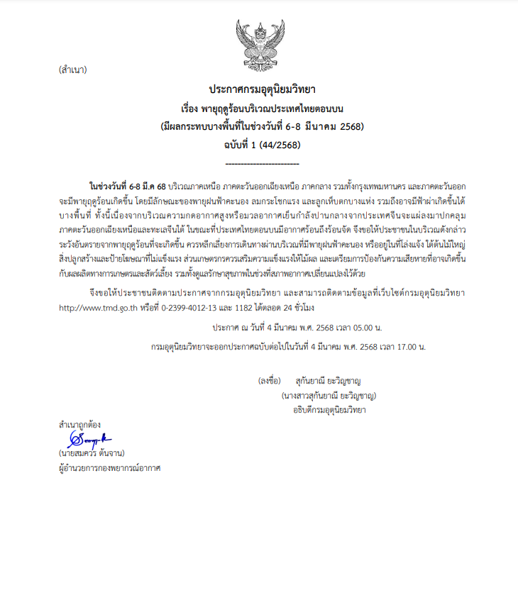 ประกาศกรมอุตุนิยมวิทยา เรื่อง พายุฤดูร้อนบริเวณประเทศไทยตอนบน มีผลกระทบบางพื้นที่ในช่วงวันที่ 6-8 มีนาคม 2568 ฉบับที่ 1 (44/2568)