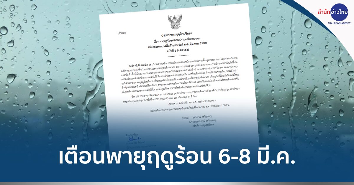 ในช่วงวันที่ 6-8 มี.ค 68 บริเวณภาคเหนือ ภาคตะวันออกเฉียงเหนือ ภาคกลาง รวมทั้งกรุงเทพมหานคร และภาคตะวันออก จะมีพายุฤดูร้อนเกิดขึ้น โดยมีลักษณะของพายุฝนฟ้าคะนอง ลมกระโชกแรง และลูกเห็บตกบางแห่ง รวมถึงอาจมีฟ้าผ่าเกิดขึ้นได้บางพื้นที่ ทั้งนี้เนื่องจากบริเวณความกดอากาศสูงหรือมวลอากาศเย็นกำลังปานกลางจากประเทศจีนจะแผ่ลงมาปกคลุมภาคตะวันออกเฉียงเหนือและทะเลจีนใต้ ในขณะที่ประเทศไทยตอนบนมีอากาศร้อนถึงร้อนจัด จึงขอให้ประชาชนในบริเวณดังกล่าว ระวังอันตรายจากพายุฤดูร้อนที่จะเกิดขึ้น ควรหลีกเลี่ยงการเดินทางผ่านบริเวณที่มีพายุฝนฟ้าคะนอง หรืออยู่ในที่โล่งแจ้ง ใต้ต้นไม้ใหญ่ สิ่งปลูกสร้างและป้ายโฆษณาที่ไม่แข็งแรง ส่วนเกษตรกรควรเสริมความแข็งแรงให้ไม้ผล และเตรียมการป้องกันความเสียหายที่อาจเกิดขึ้น กับผลผลิตทางการเกษตรและสัตว์เลี้ยง รวมทั้งดูแลรักษาสุขภาพในช่วงที่สภาพอากาศเปลี่ยนแปลงไว้ด้วย