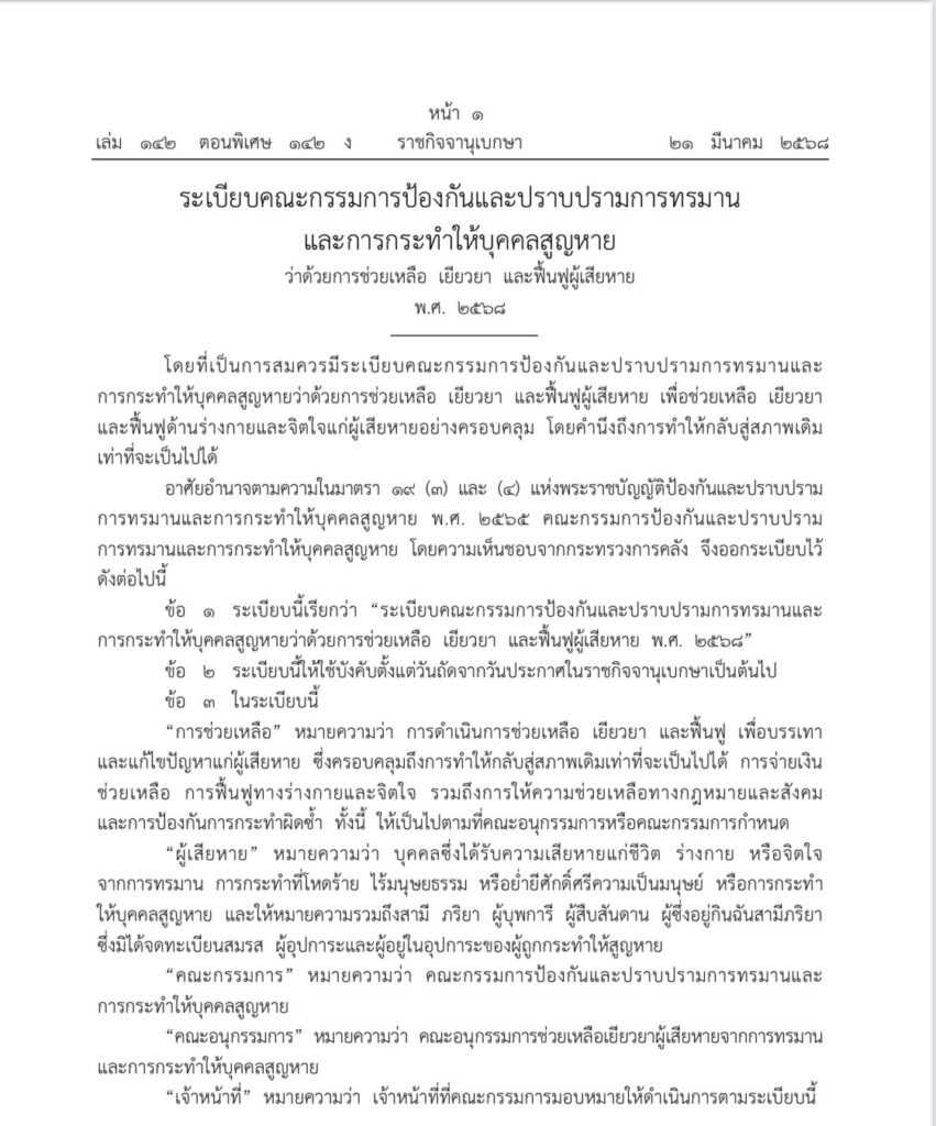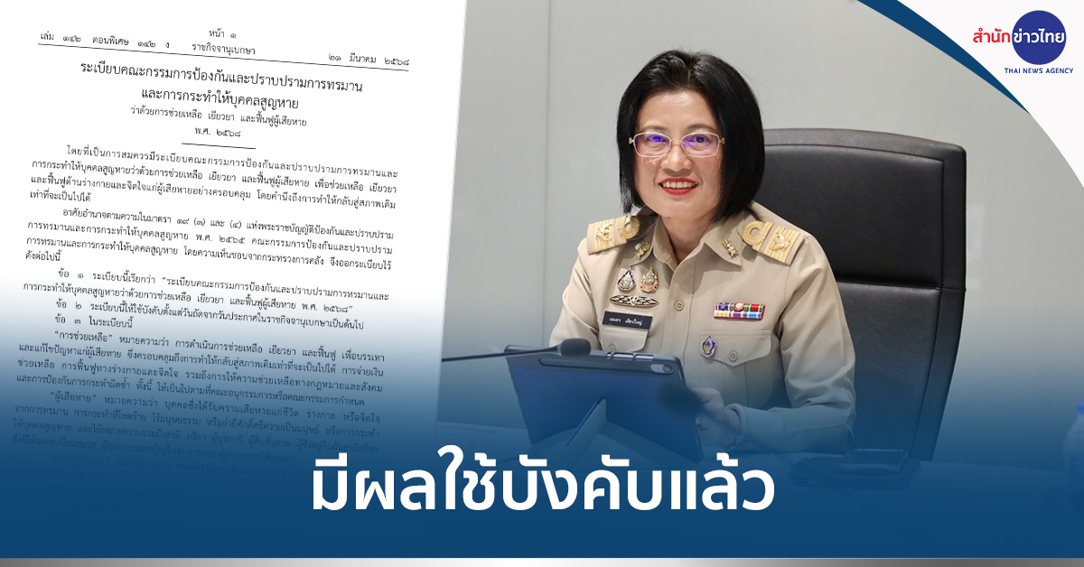 วันนี้ ( 22 มี.ค. 2568 ) นางสาวเอมอร เสียงใหญ่ อธิบดีกรมคุ้มครองสิทธิและเสรีภาพ เปิดเผยว่า ระเบียบคณะกรรมการป้องกันและปราบปรามการทรมานและการกระทำให้บุคคลสูญหายว่าด้วยการช่วยเหลือ เยียวยา และฟื้นฟูผู้เสียหาย พ.ศ. 2568 มีผลใช้บังคับแล้ว ในวันนี้