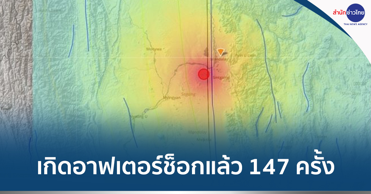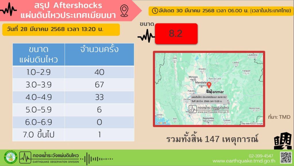 กองเฝ้าระวังแผ่นดินไหว กรมอุตุนิยมวิทยา รายงานว่า จนถึงเช้าวันนี้ (30 มีนาคม 2568 เวลา 06.00 น.) เกิดอาฟเตอร์ช็อก (Aftershock) รวมแล้ว 147 ครั้ง โดยแบ่งตามขนาดดังนี้