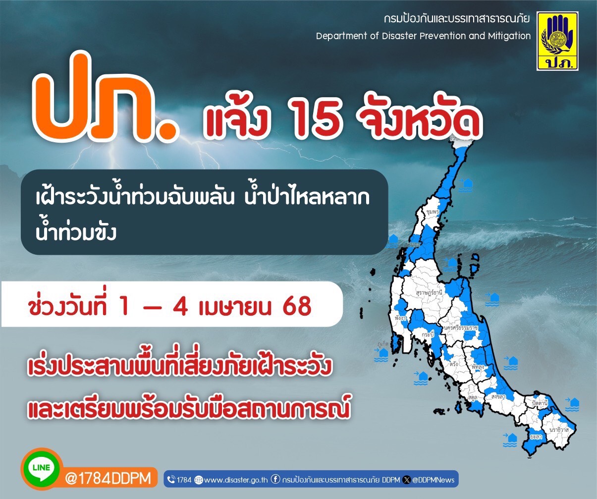1 เม.ย. – ปภ.แจ้ง 15 จังหวัด เฝ้าระวังน้ำท่วมฉับพลัน น้ำป่าไหลหลาก และน้ำท่วมขัง ช่วงวันที่ 1-4 เมษายน 68 เร่งประสานพื้นที่เสี่ยงภัยเฝ้าระวังและเตรียมพร้อมรับมือสถานการณ์