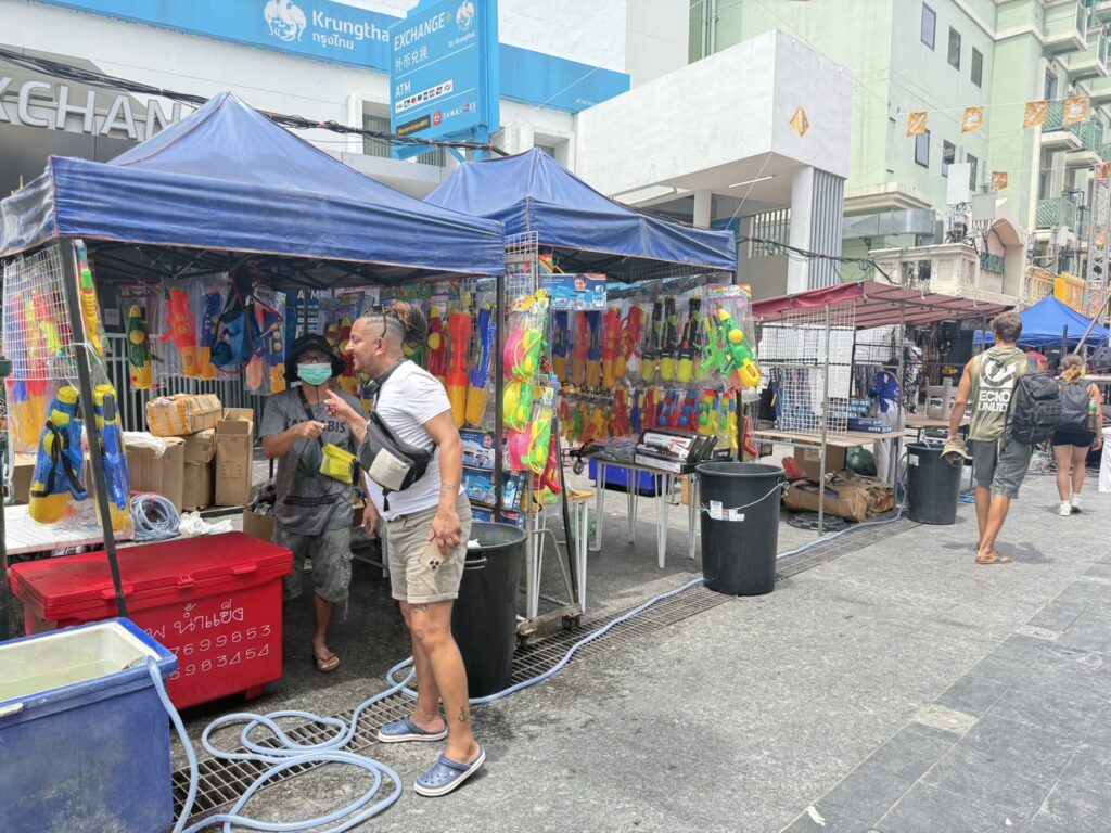 ขณะที่ร้านจำหน่ายปืนฉีดน้ำในพื้นที่พบว่ามีราคาตั้งแต่ 100 บาท ไปจนถึง 700 บาท แต่ละร้านมีจุดให้บริการเติมน้ำ หากซื้อปืนฉีดน้ำแถมเติมน้ำฟรี หากเติมครั้งต่อไปเสียครั้งละ 5-10 บาท โดยที่นักท่องเที่ยวนิยมคือการชิมอาหารสตรีทฟู้ดที่เริ่มมีขายสองฝั่งของถนนข้าวสาร เช่น ผัดไทย ข้าวไข่เจียว และน้ำมะม่วงปั่น เป็นต้น.-417-สำนักข่าวไทย