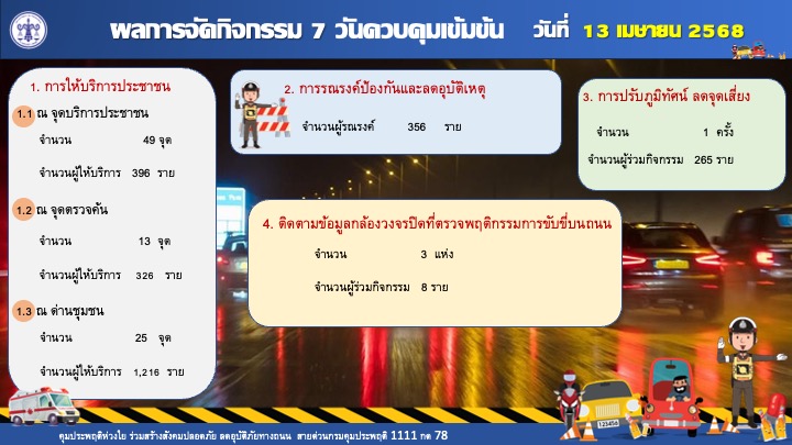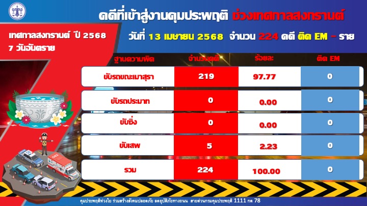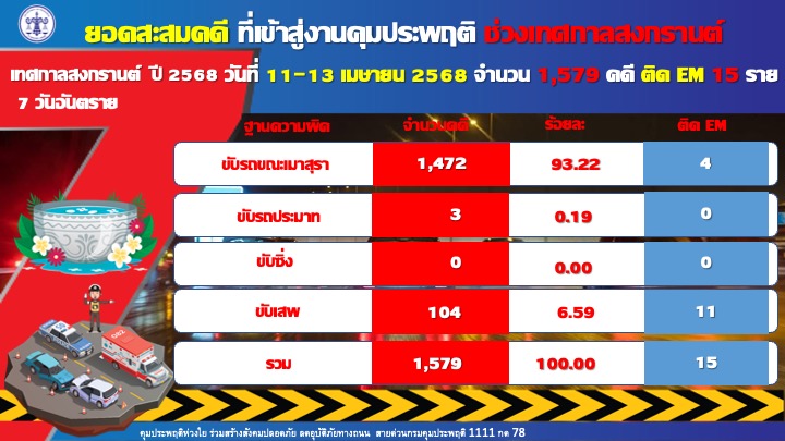 ขณะที่ยอดคดีสะสมในช่วง 3 วันแรกของเทศกาลสงกรานต์ อยู่ที่ 1,579 คดี และติดอุปกรณ์ EM ยังคงเดิมที่ 15 ราย แบ่งเป็น
