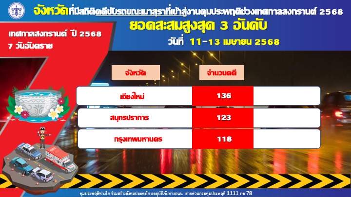 จังหวัดที่มีคดีเมาขับสูงสุด ได้แก่ เชียงใหม่ 136 คดี รองลงมาคือ สมุทรปราการ 123 คดี และกรุงเทพมหานคร 118 คดี ทั้งนี้ เมื่อเปรียบเทียบสถิติคดีเข้าสู่คุมประพฤติในวันที่ 3 ของปี 2567 พบว่า คดีขับรถขณะเมาสุรา จำนวน 242 คดี และ ปี 2568 จำนวน 219 คดี ลดลง 23 คดี